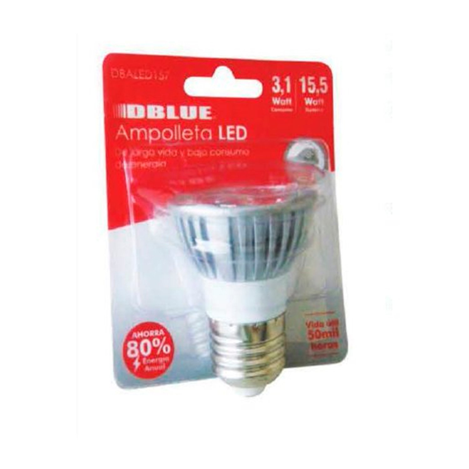 Ampolleta LED dblue, consumo de 3,1 W y ilumina con 15,5 W. conector E27 y libre de mercurio. ahorra hasta un 80% más en comparación con una ampolleta incandescente.