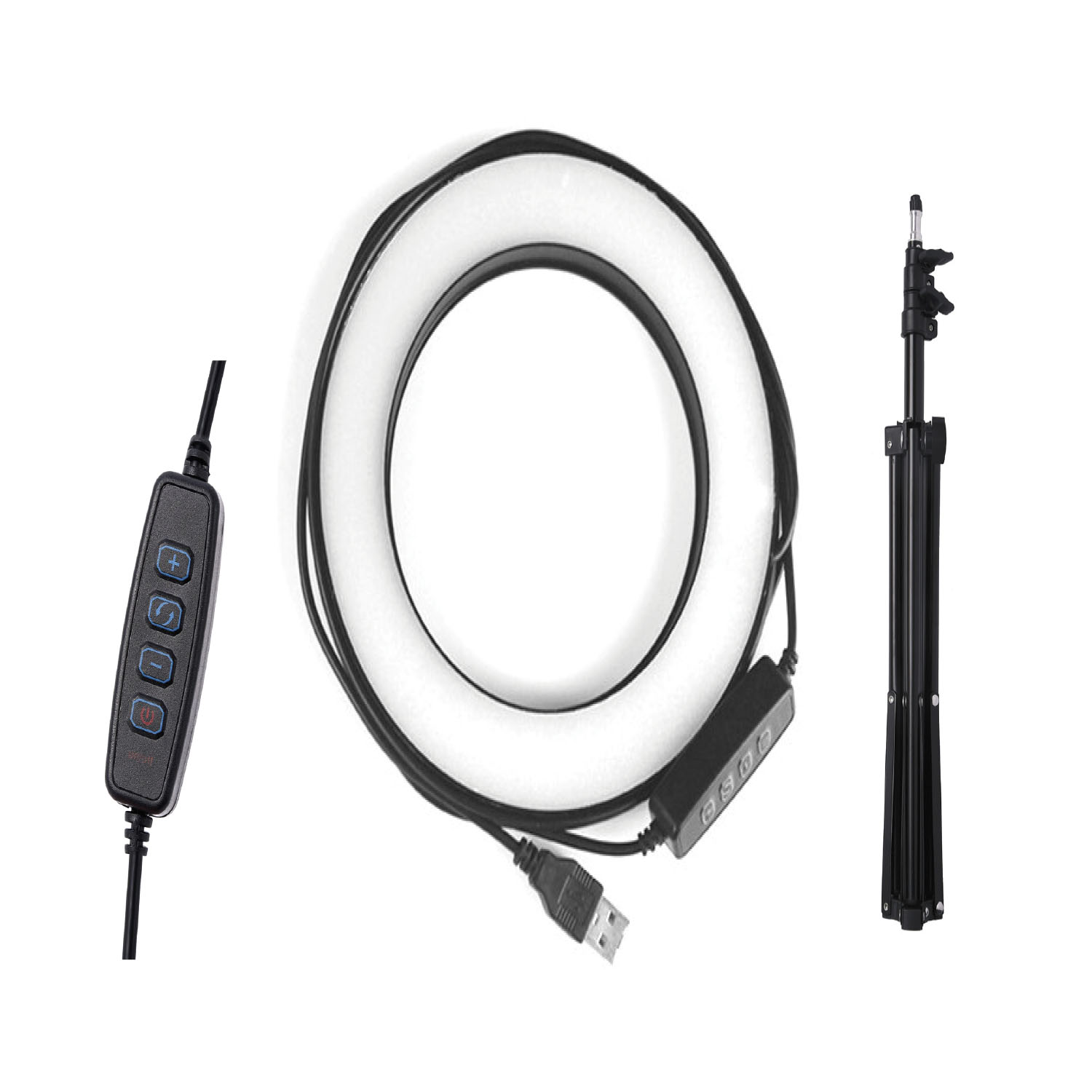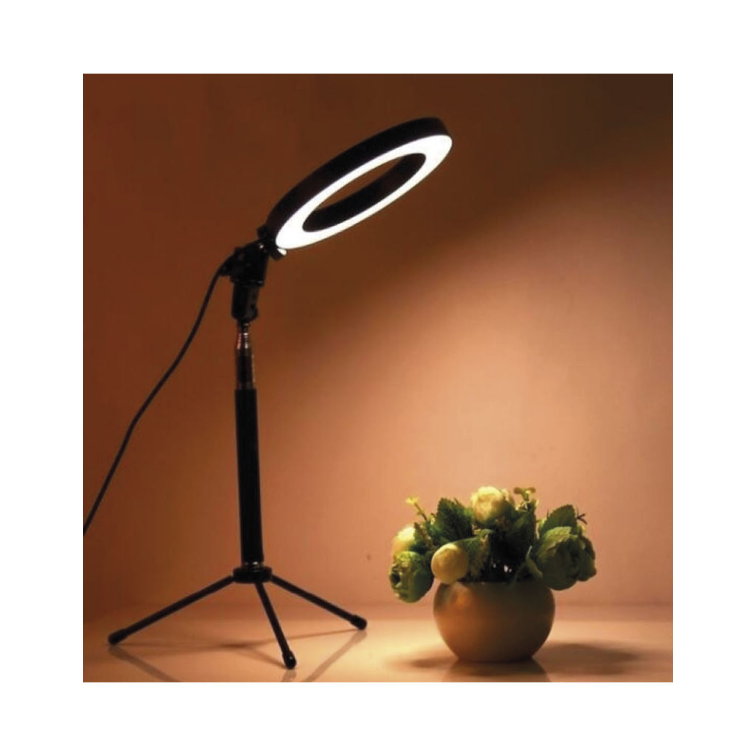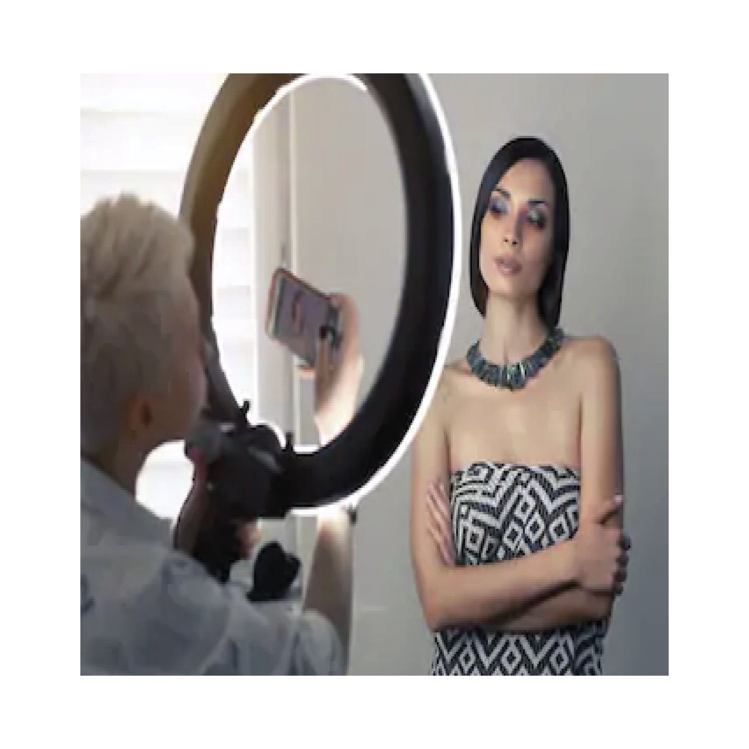 Iluminación para selfies, compuesto de un trípode y un anillo de luz. utilizable en streaming, telefonía y eventos.