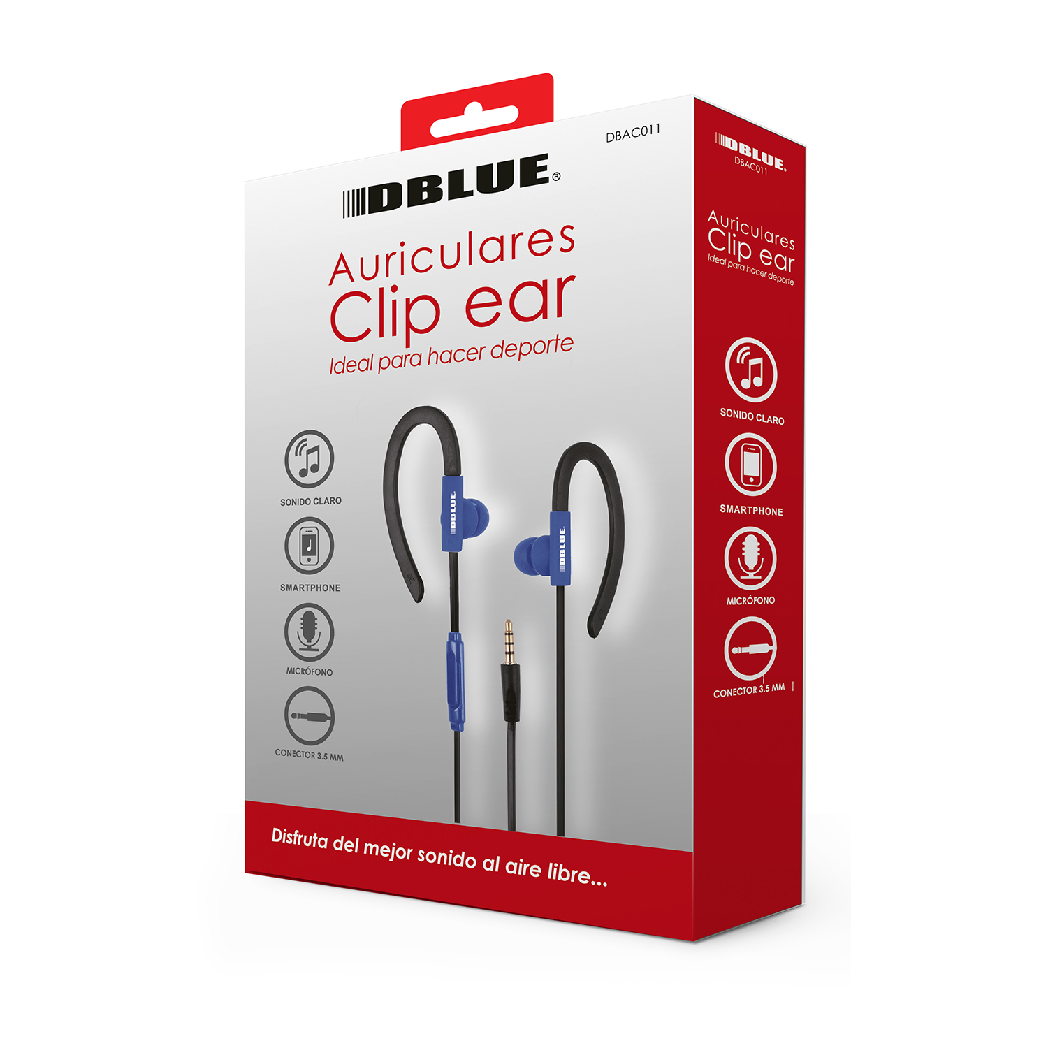Auriculares clip ear con microfono y cancelacion de ruido, ideales para deportes y actividades al aire libre. con microfono y un plug 3.5 mm. disponibles en azul, rojo y blanco.