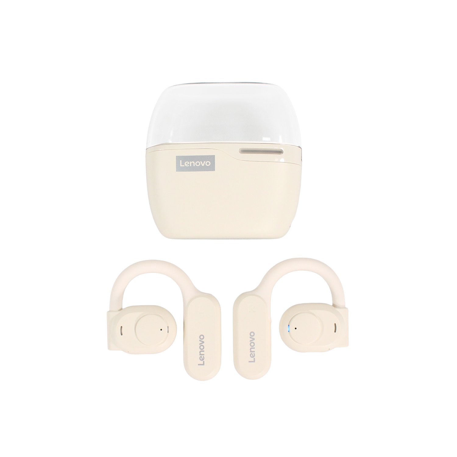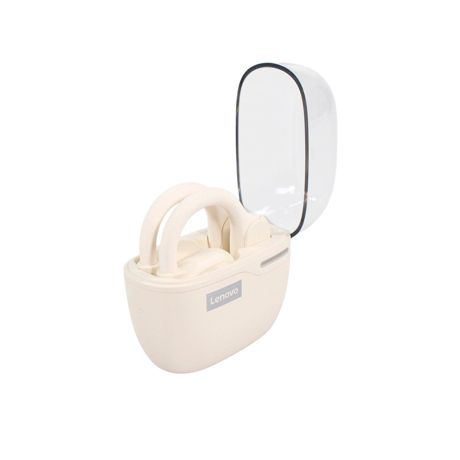 Lenovo, BT 5.3, 400 mAh en carcasa, 10 h música, diseño de gancho oreja, graves profundos, control táctil