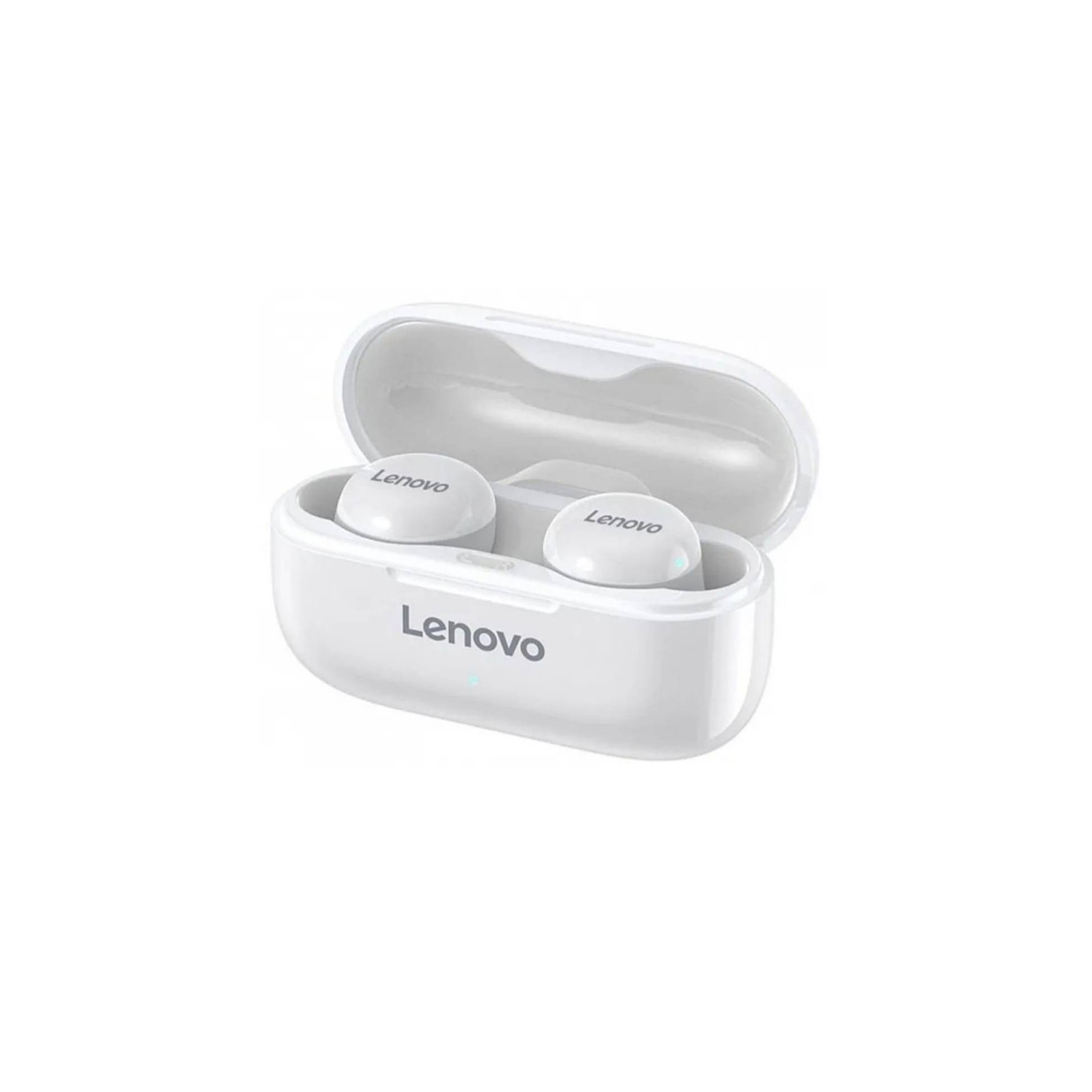 Audífonos inalámbricos TWS de la marca lenovo, con tecnología bluetooth 5.0 y diseño blanco.