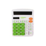 La calculadora de 12 dígitos en color verde ofrece funciones básicas, memoria integrada y cálculo de cadena. Funciona con pila AA, ideal para uso diario en oficina o estudio.