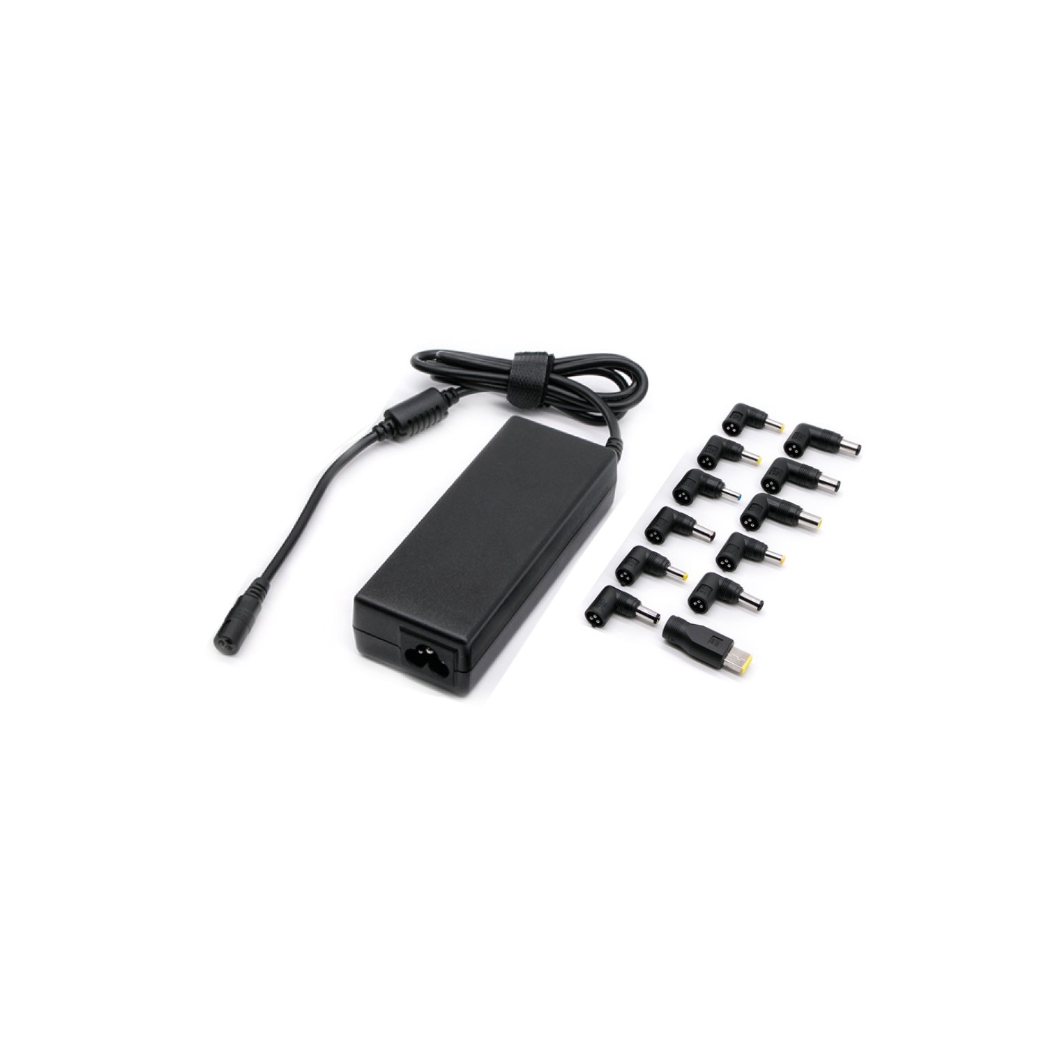 Cargador universal para notebook con conectores hasta 9 tipos, salida de hasta 90W y voltaje automático. Compatible con varios dispositivos.