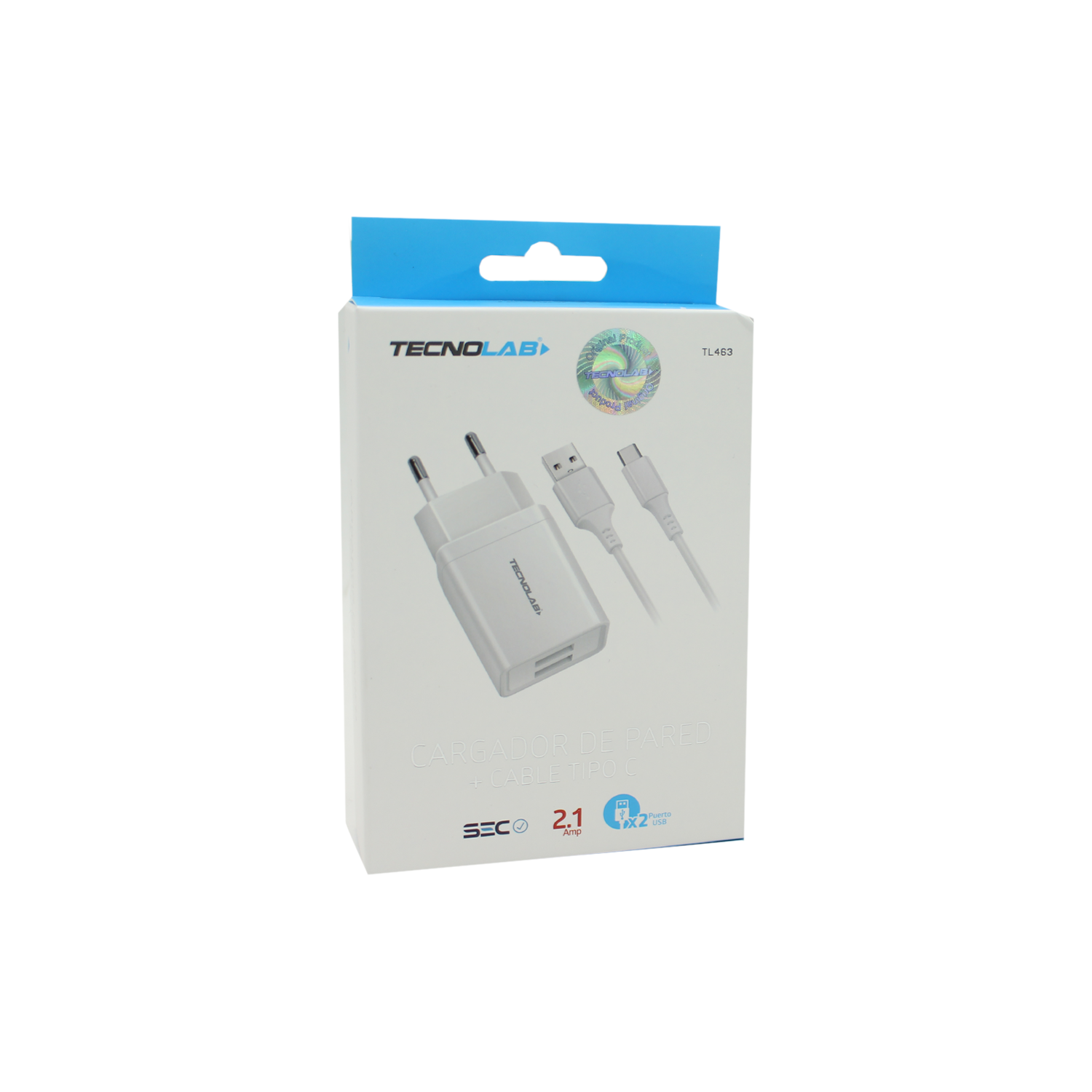 Cargador de pared Tecnolab, tipo C a doble USB 2.1A,