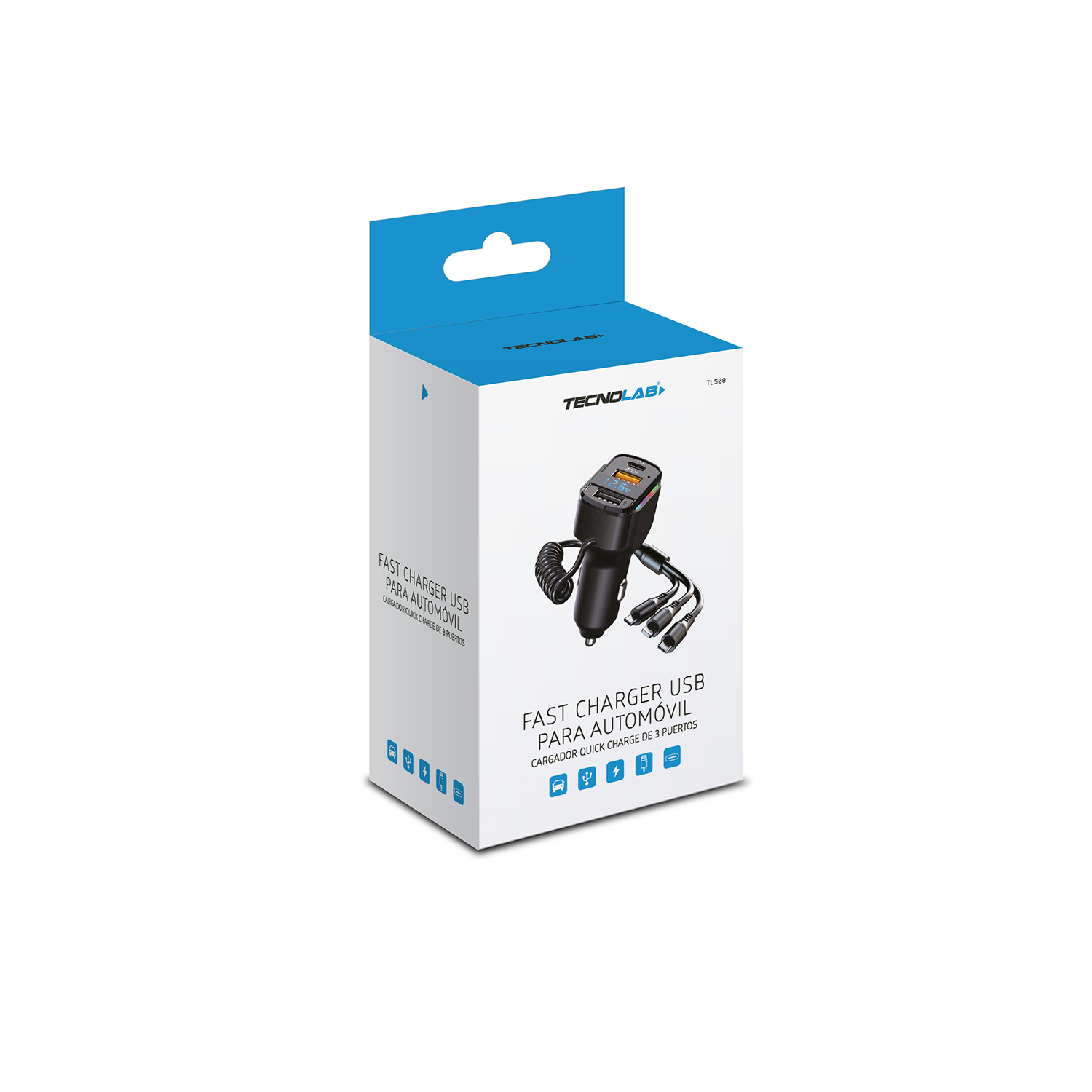 CARGADOR TECNOLAB DE AUTOMOVIL, ILUMINACION RGB 7 COLORES, USB 5V 3.1A, DETECCION VOLTAJE, CABLE 3 EN 1, 36W/65W.
