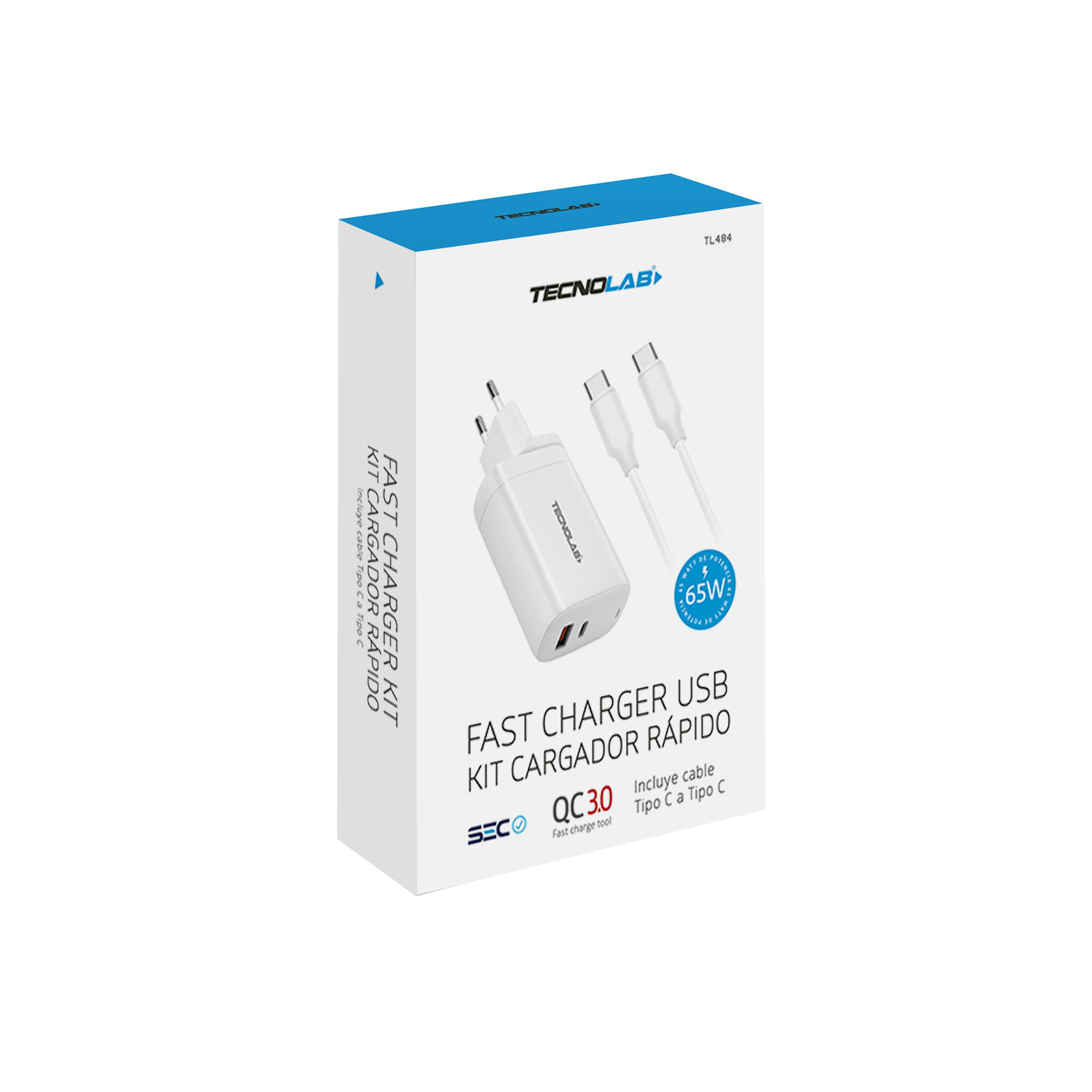 CARGADOR TECNOLAB QC 3.0 + PD 65W CON CABLE TIPO C A C. CERTIFICACIÓN SEC. WHITE