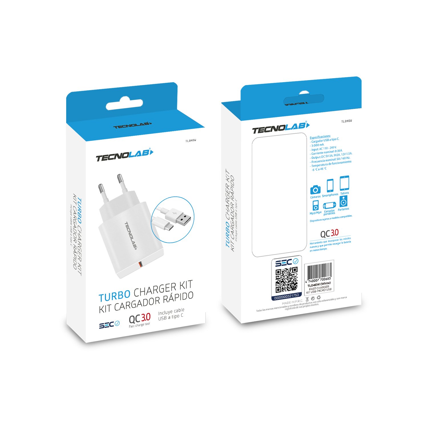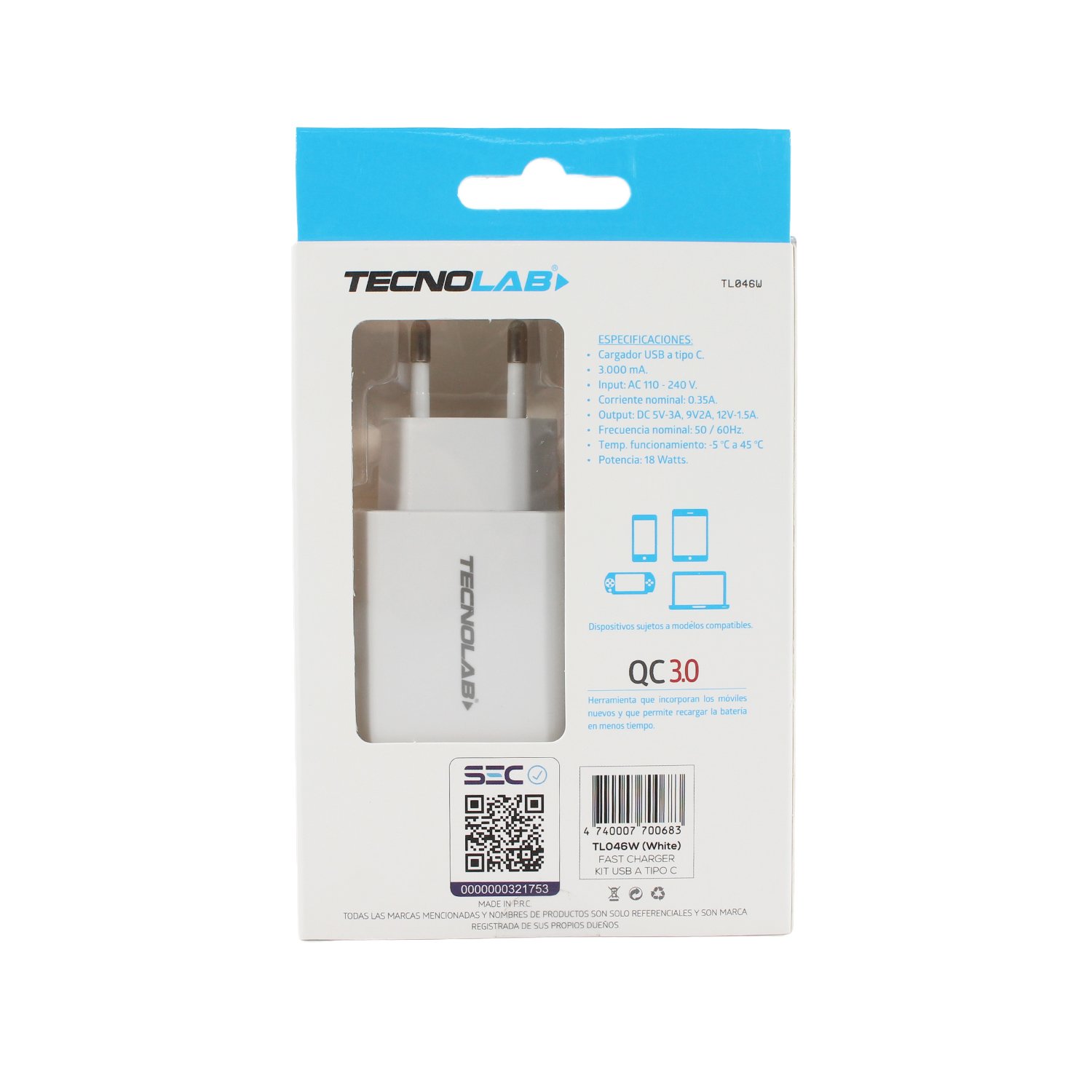 Cargador Tecnolab 18W USB a C White