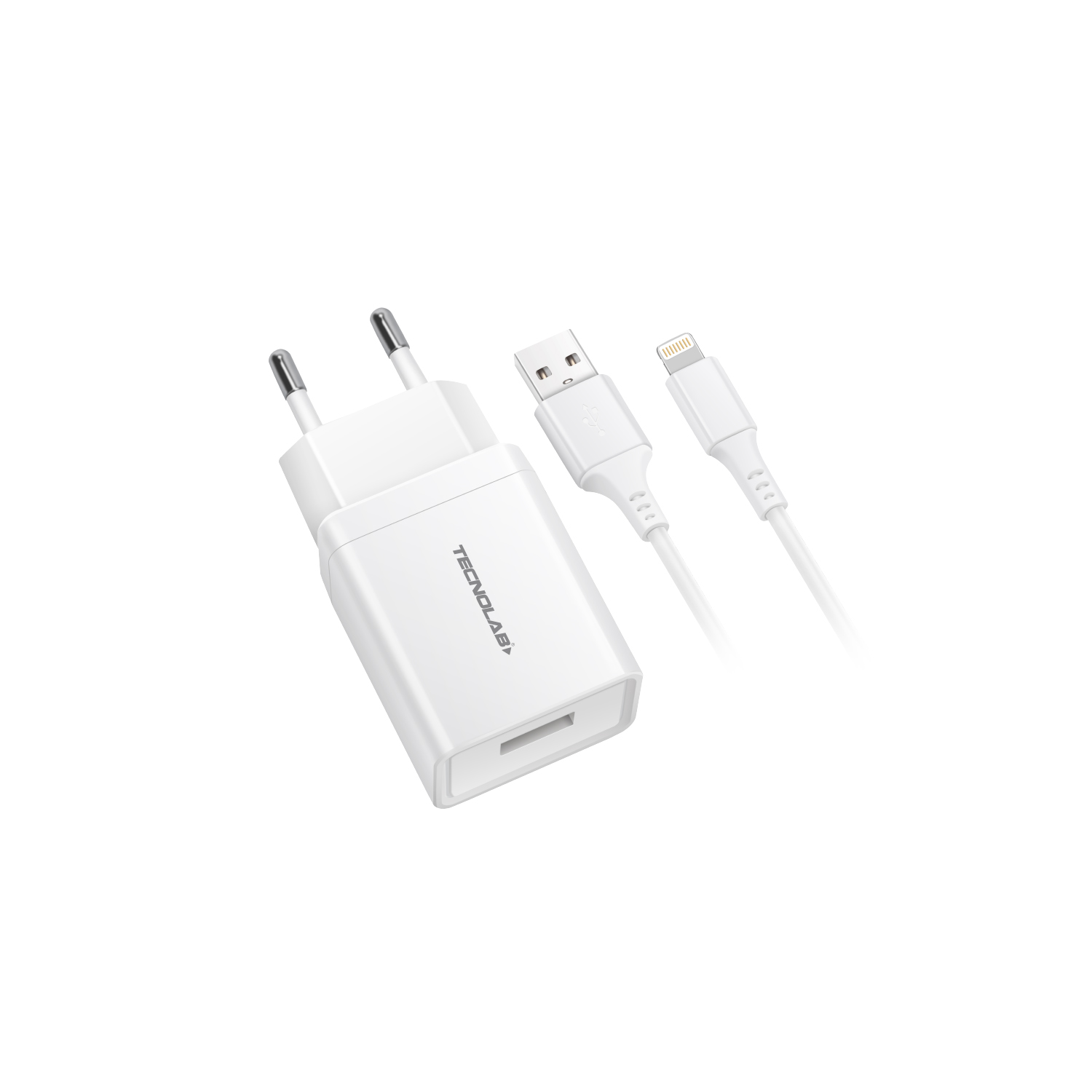 CARGADOR TECNOLAB SALIDA USB 10.5W CON CABLE USB A LIGHTNING. CERTIFICACION SEC. WHITE