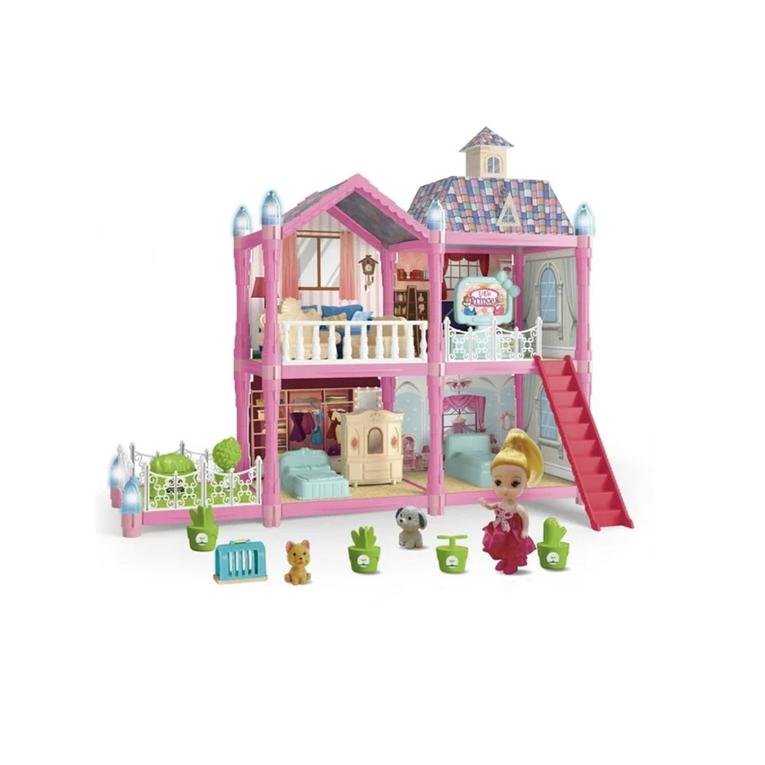 CASA DE MUÑECAS ROSADA DE 2 PISOS, 112 PIEZAS, CON LUCES, PARA NIÑOS MAYORES DE 3 AÑOS.