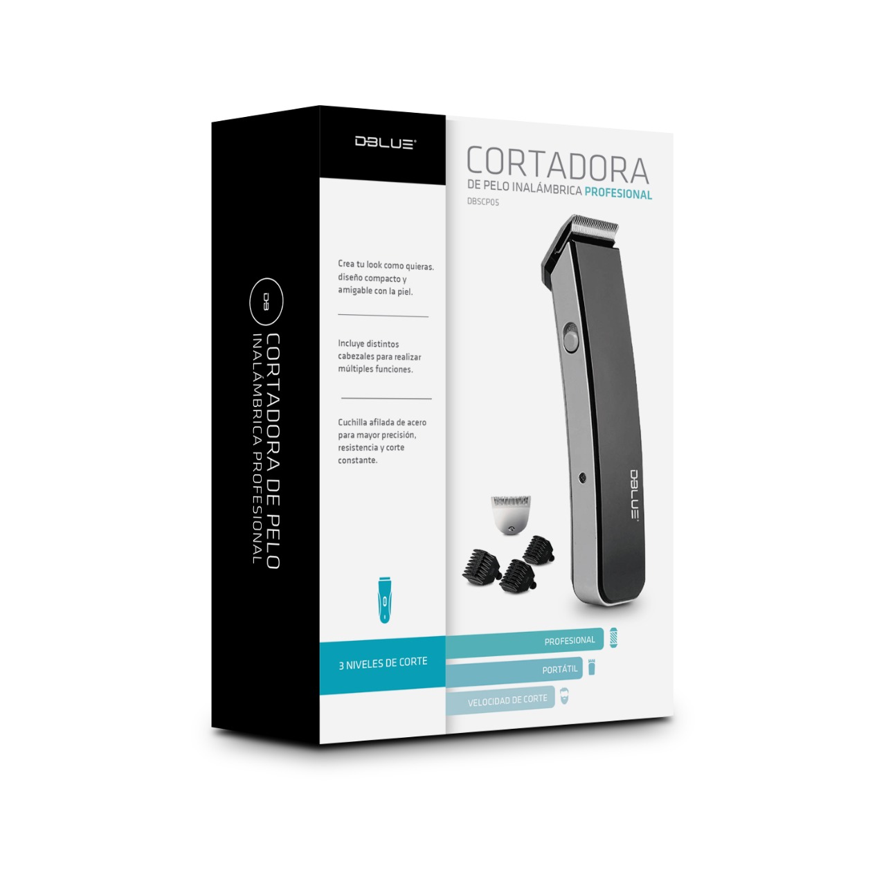 CORTADORA DE CABELLO DBLUE PROFESIONAL, INALAMBRICA, CUCHILLAS DE ACERO, AJUSTABLE, 3 LONGITUDES DE CORTE. BLACK