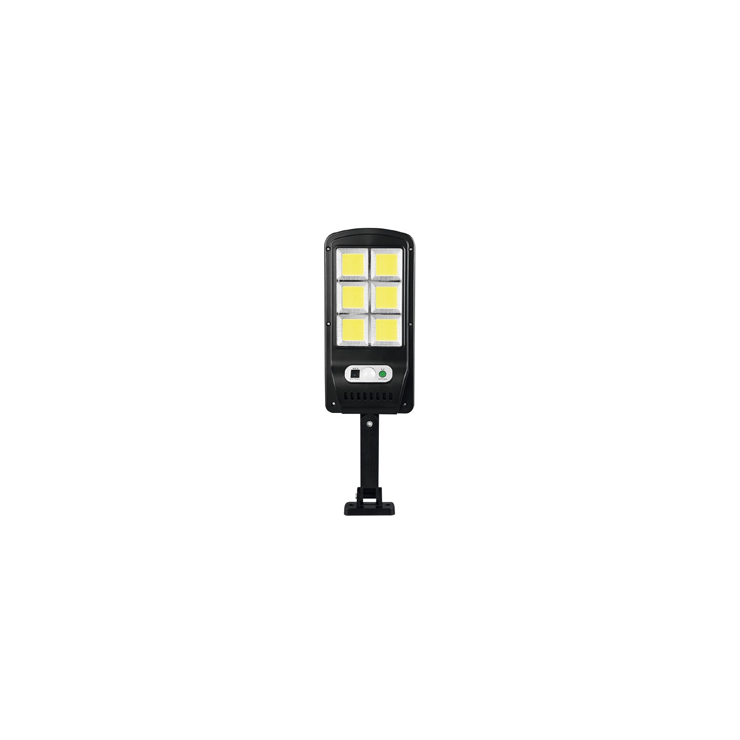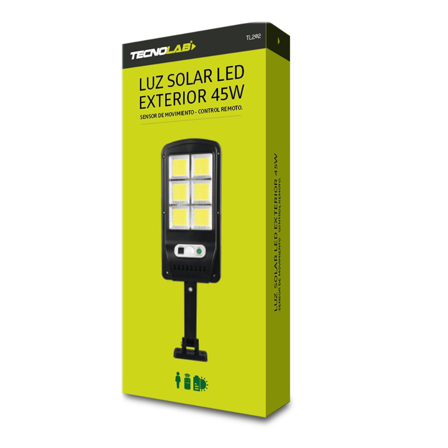 Iluminación exterior solar con sensor de movimiento de 20W, fabricado por tecnolab. incluye control remoto y tiene tres niveles seleccionables de iluminación. ideal para calles o jardines.
