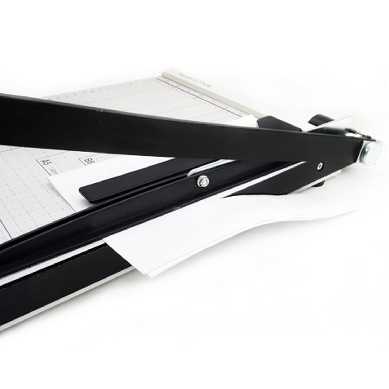 Guillotina resistente y precisa, ideal para cortar múltiples hojas con facilidad y seguridad en oficinas, colegios o talleres gráficos.