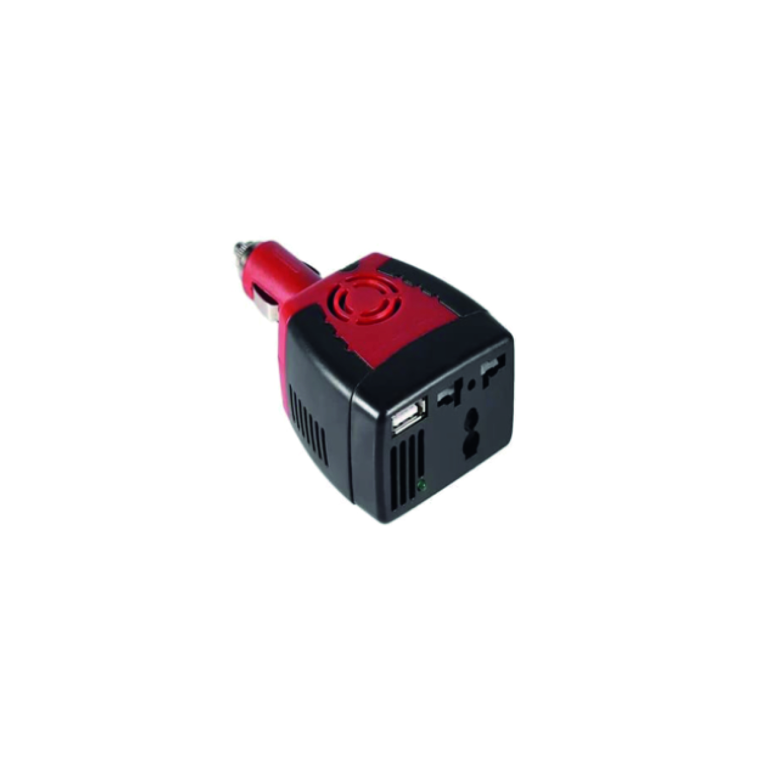 Inversor portátil de corriente para autos, convierte 12V a 220V y soporta 150W a 0.5A.