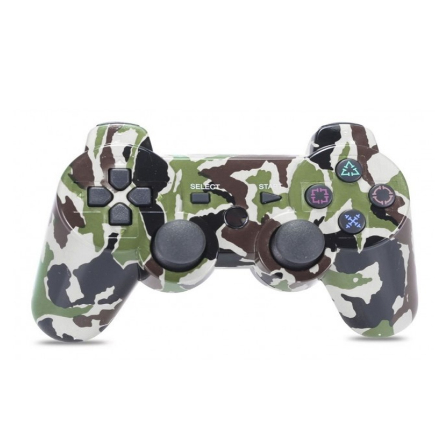 Control play station 3 dual shock bluetooth wireless con entrada de 6 axiales. mimetizado en color verde. wireless BT, doble vibración, d-shock 3, motor doble, sixaxis, sensores de movimiento y 12 botones programables.