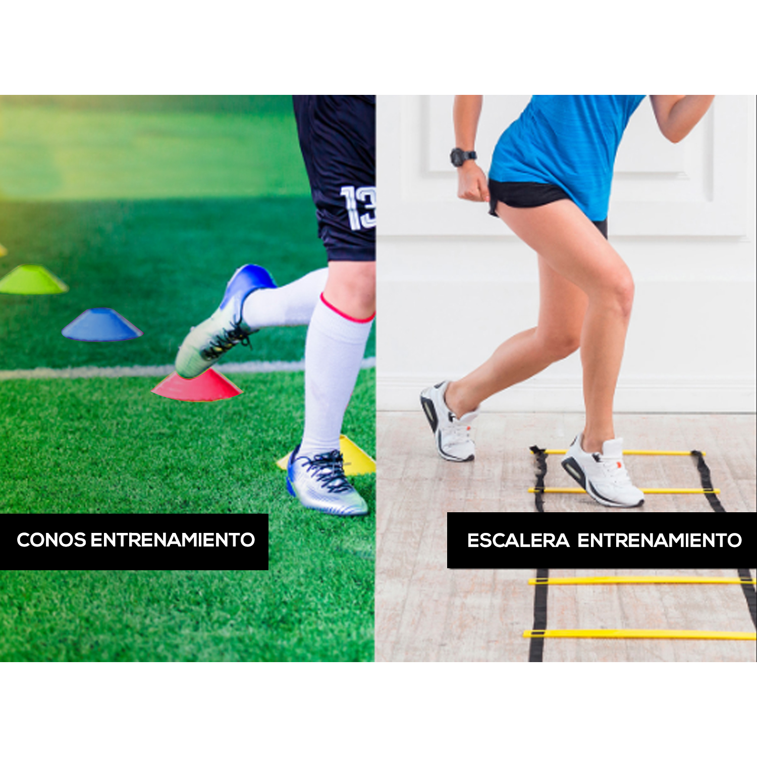 Kit de entrenamiento que incluye 3 vallas y 1 escalerilla para realizar ejercicios de fuerza y resistencia, además de 10 conos para mejorar la coordinación y agilidad.