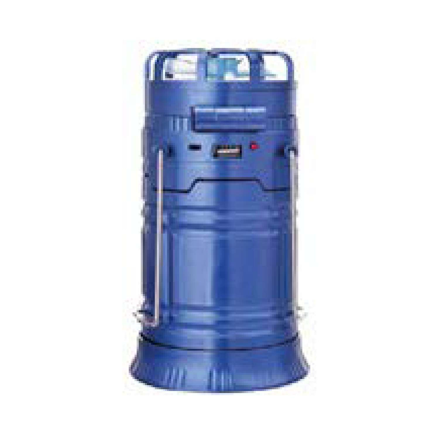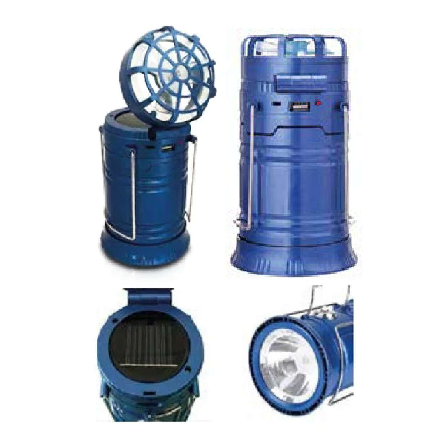 Lámpara LED de camping con ventilador y conector de carga azul. ideal para camping, caza o emergencias. poder de iluminación increíble, carga solar y directa a corriente. peso 0,4 kg, dimensiones 9,5 × 17,5 × 9,5 cm.