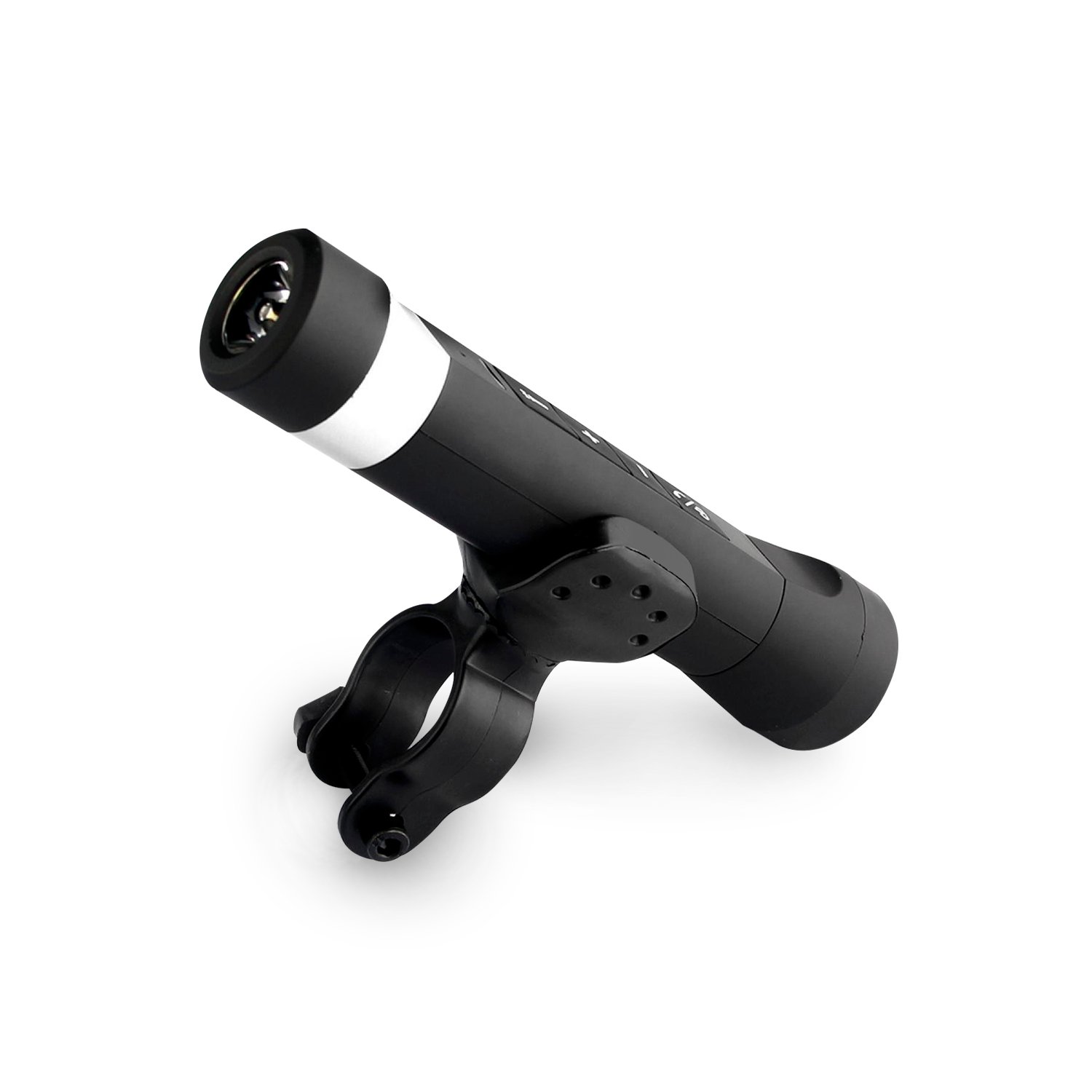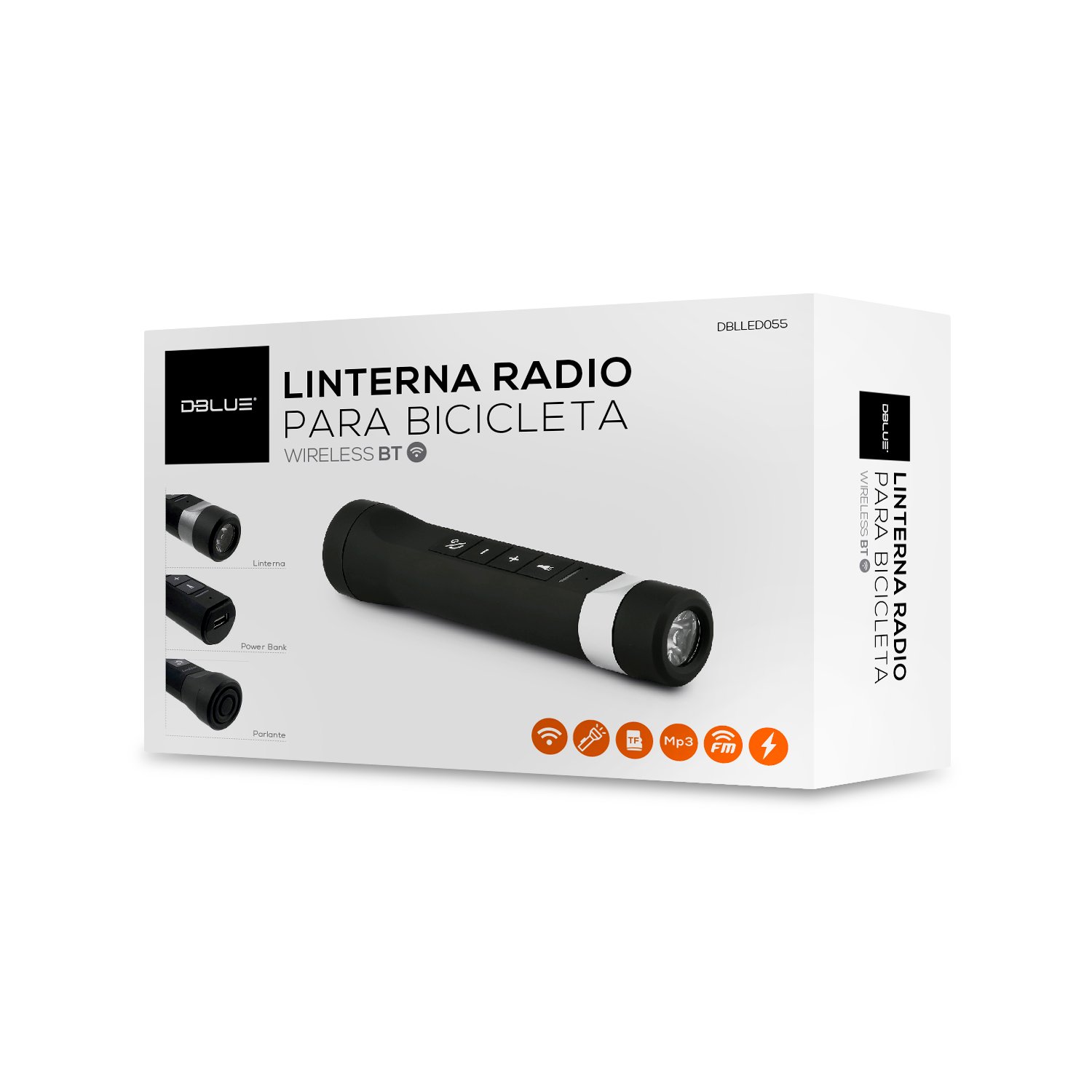 Linterna con radio FM y bluetooth, diseñada para bicicletas. incluye soporte para bicicleta, parlante incorporado, linterna LED integrada y función bluetooth. recargable via USB con capacidad de 2200mah. modelo dblled055.