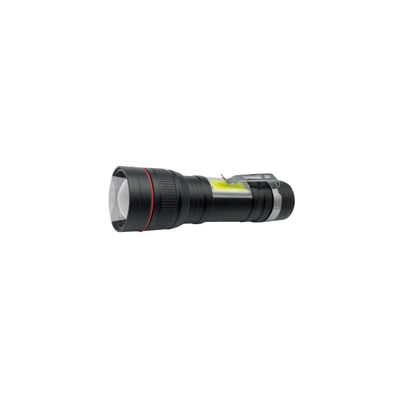 Linterna recargable, Aleación aluminio, Impermeable (no sumergible), 3 modos (alto/bajo/estroboscópico), USB charger, Batería incorporada, 1 LED principal + 1 led antorcha, Clip tipo lapicera