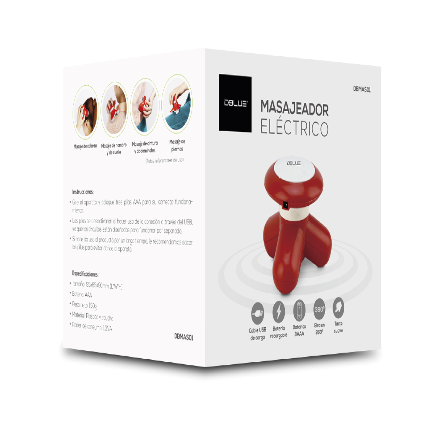 MASAJEADOR DBLUE ELECTRICO CON GIRA 360º, VIBRACION PARA MEJOR CIRCULACION, ALIVIO MUSCULAR Y FATIGA. FUNCIONA CON PILA AAA O USB. RED