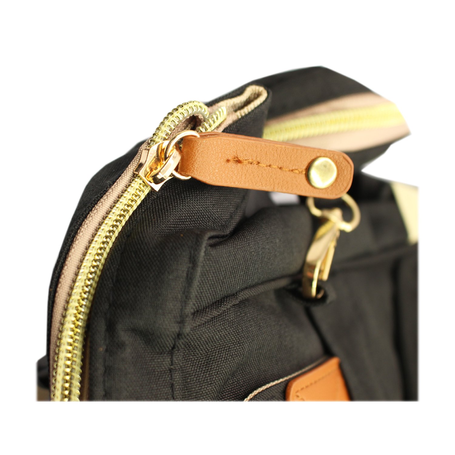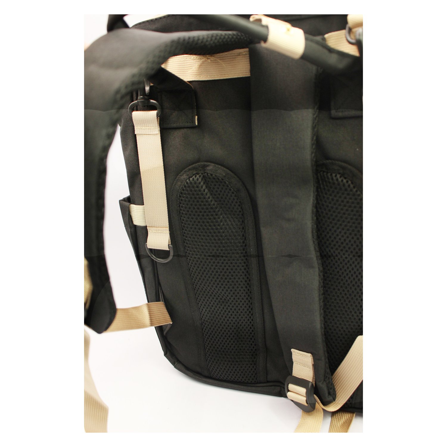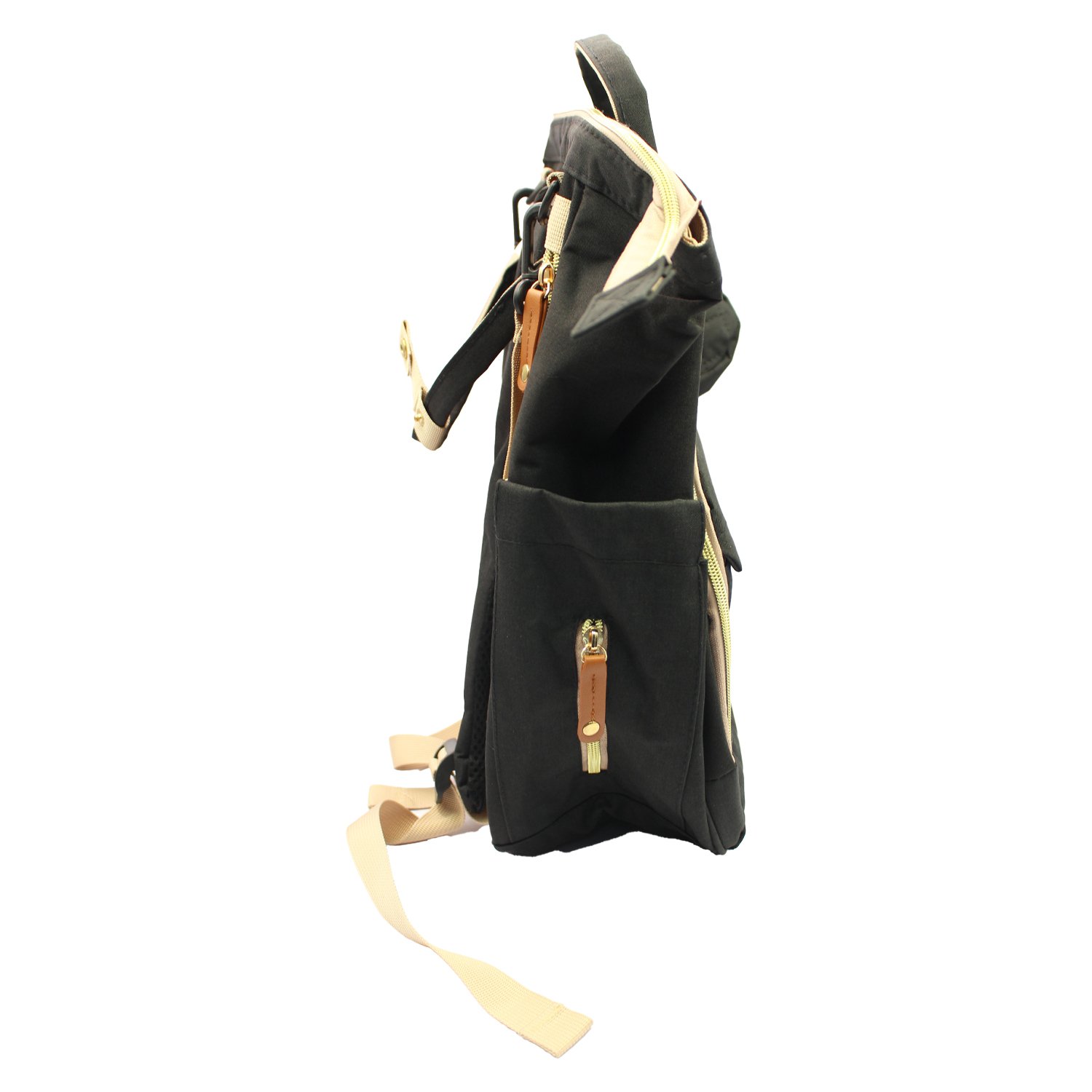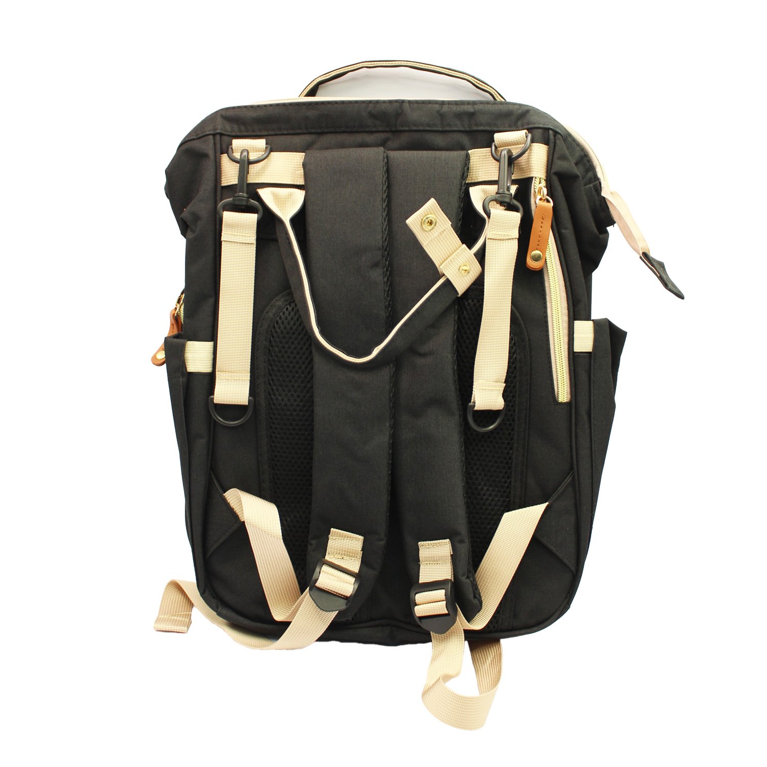 Mochila pañalera negra, ideal para actividades al aire libre y viajes.