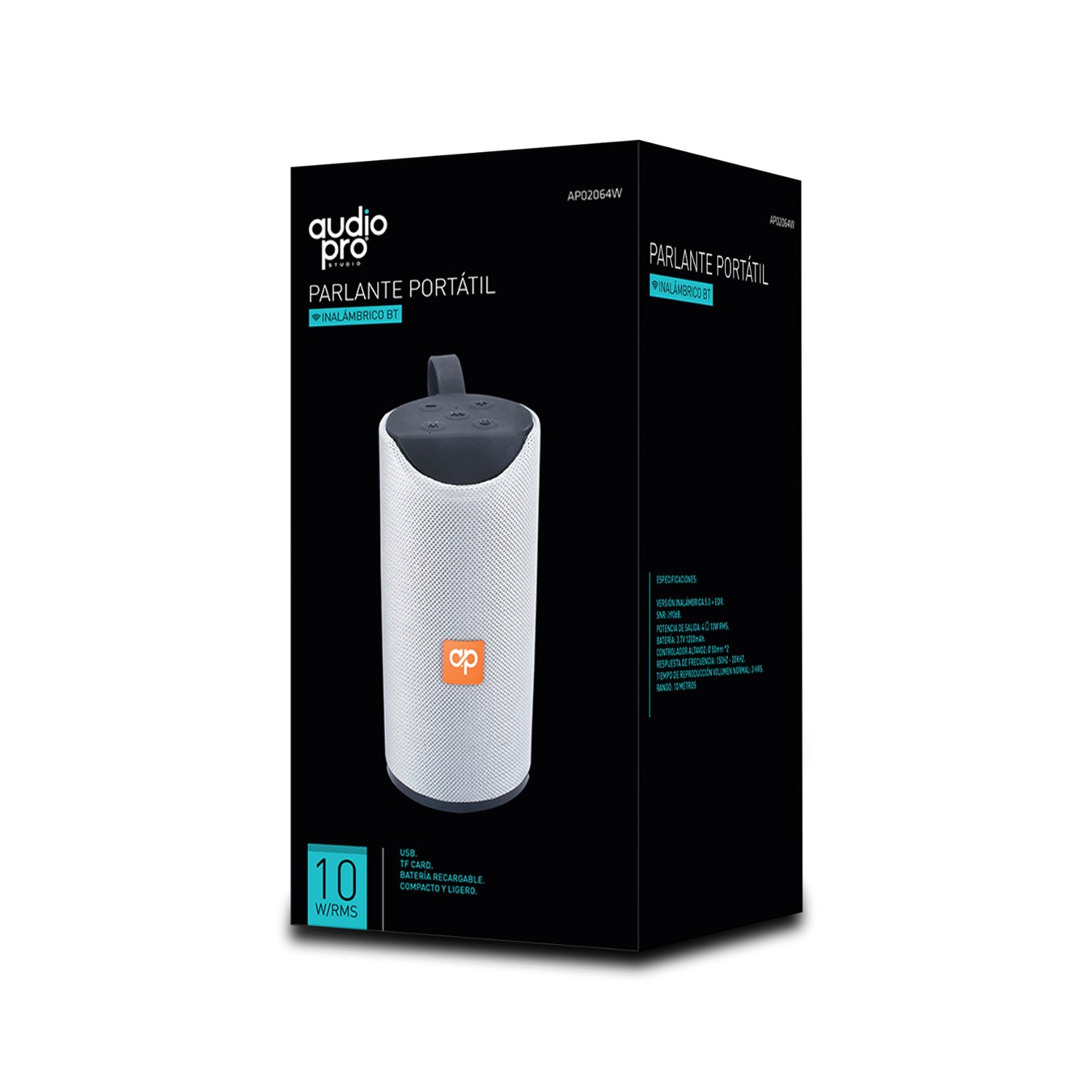 Parlante portátil de audiopro con conectividad bluetooth, USB y SD. tiene una potencia de salida de 10W y una respuesta de frecuencia de 120hz – 20khz. la batería es de 3V y 1200mah, lo que permite una duración de hasta 3 horas en volumen normal. admite conectividad inalámbrica a través del protocolo 5.0 + EDR con un rango de hasta 10 metros. compatible con tarjetas TF y tiene un diseño compacto y ligero.
