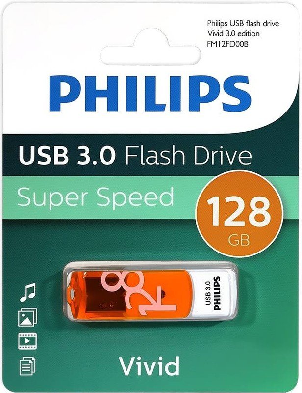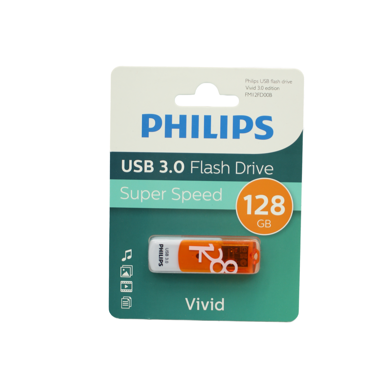 Pendrive USB 3, 128 GB, Respalda fotos/videos/música, Color naranjo/blanco, Marca Philips