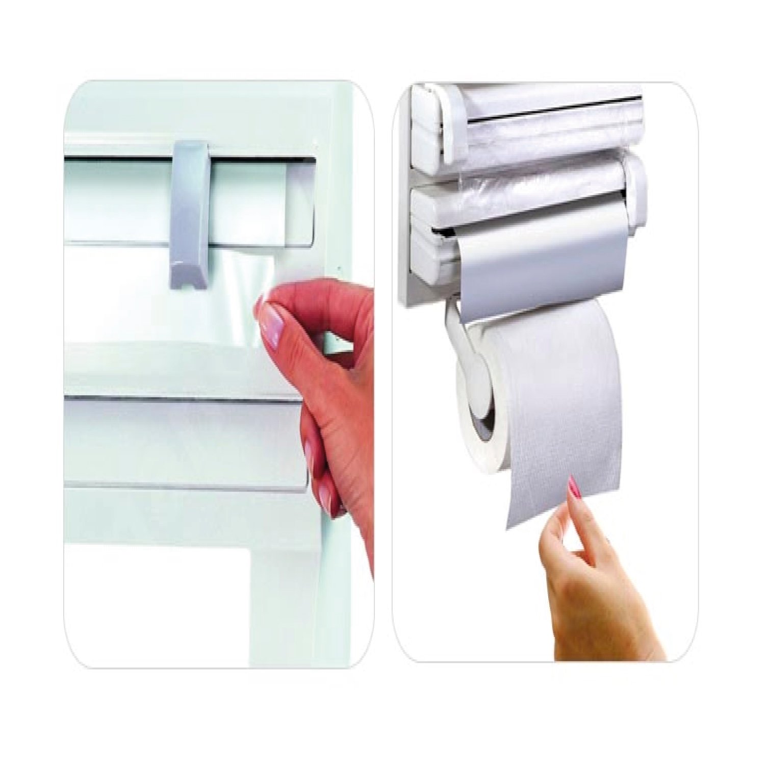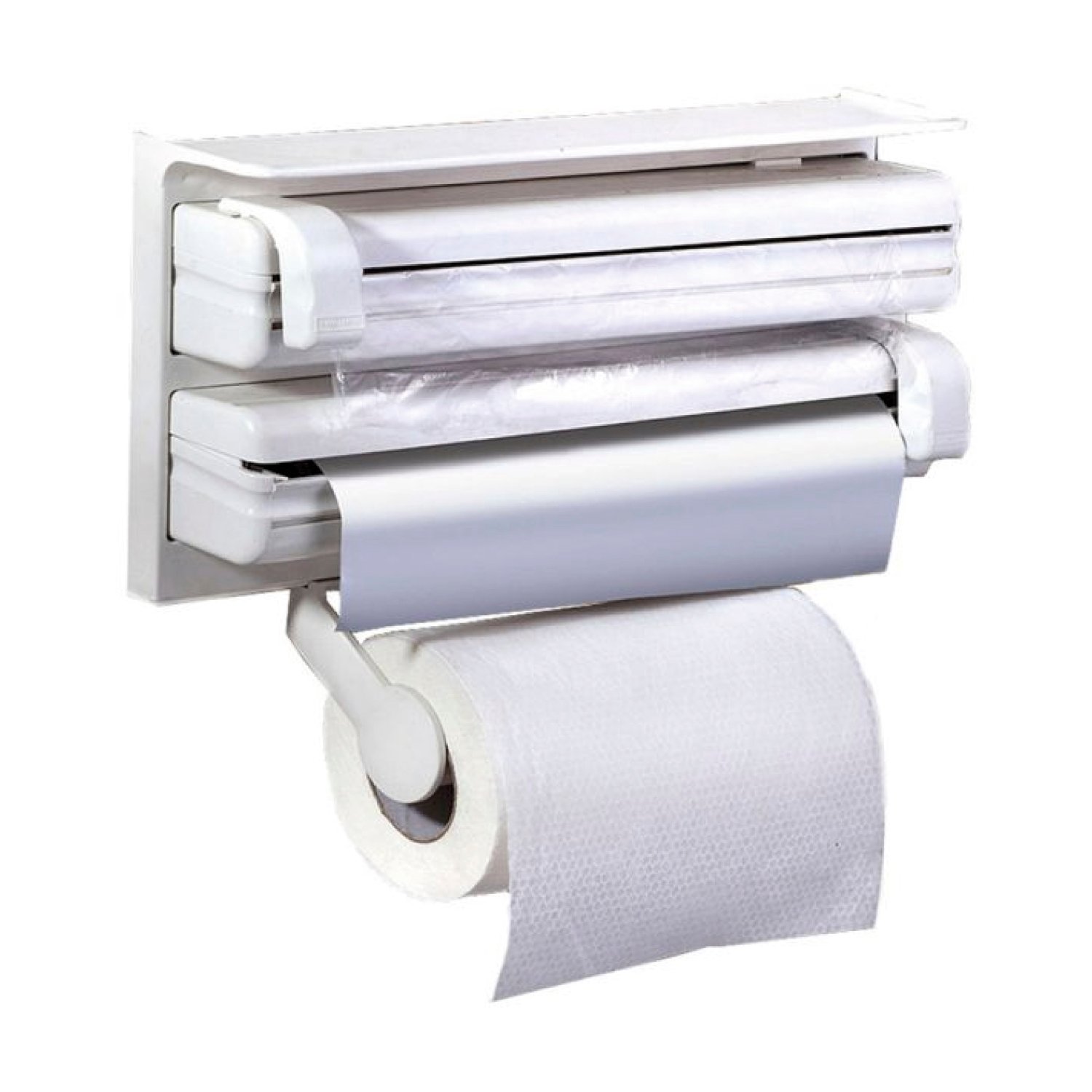 Dispensador de papel triple, Para toalla/papel film/papel aluminio, Cortante deslizante para film, Medidas 39×19×7 cm, Medida interna rollos 34×5×5 cm