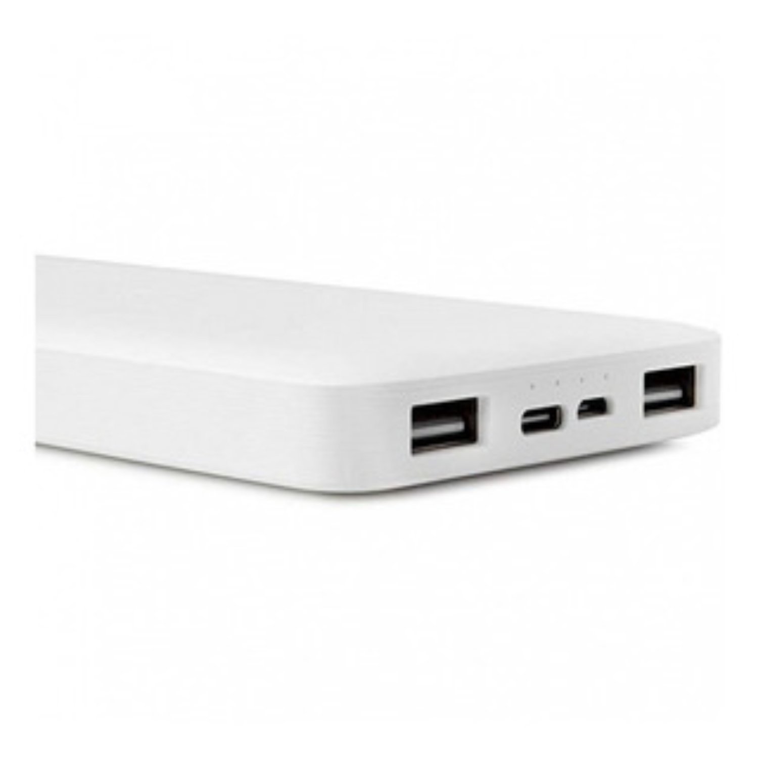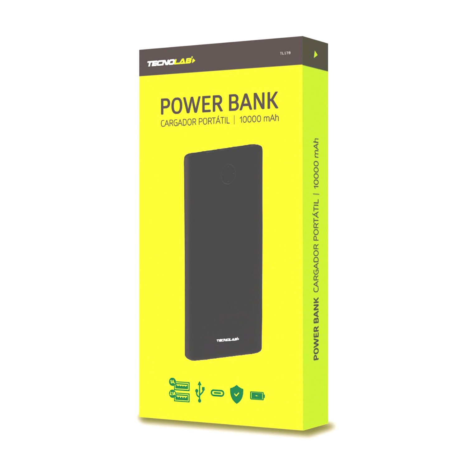 Powerbank de 10.000 mah con pantalla indicador de carga, entrada DC 5V 3A y salida DC 5V 3A. incluye cables micro USB, tipo C e i-phone, así como cable de carga usb/tipo C y manual de uso en español e inglés. presentado en estuche de cartón forrado color blanco con certificaciones.