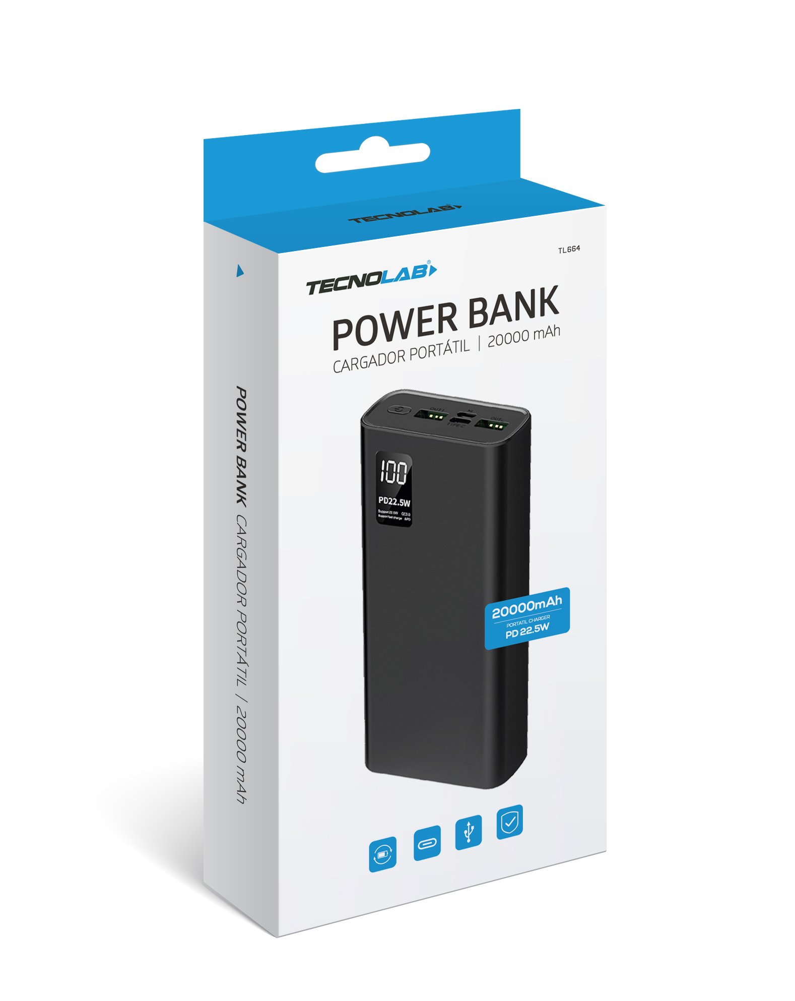POWERBANK TECNOLAB 20000MAH BATERIA LITIO, PD 22.5W, PROTECCION SOBRECARGA, AMPLIA COMPATIBILIDAD. BLACK