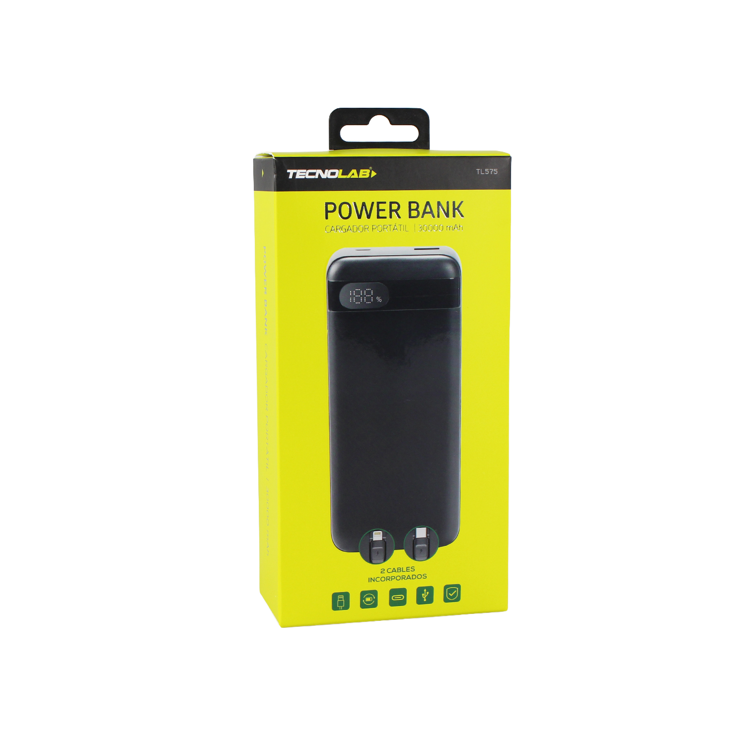 POWERBANK TECNOLAB 30000MAH, 22.5WATTS – CARGA RAPIDA, 2 CABLES INCORPORADOS, PROTECCION SOBRECARGA.