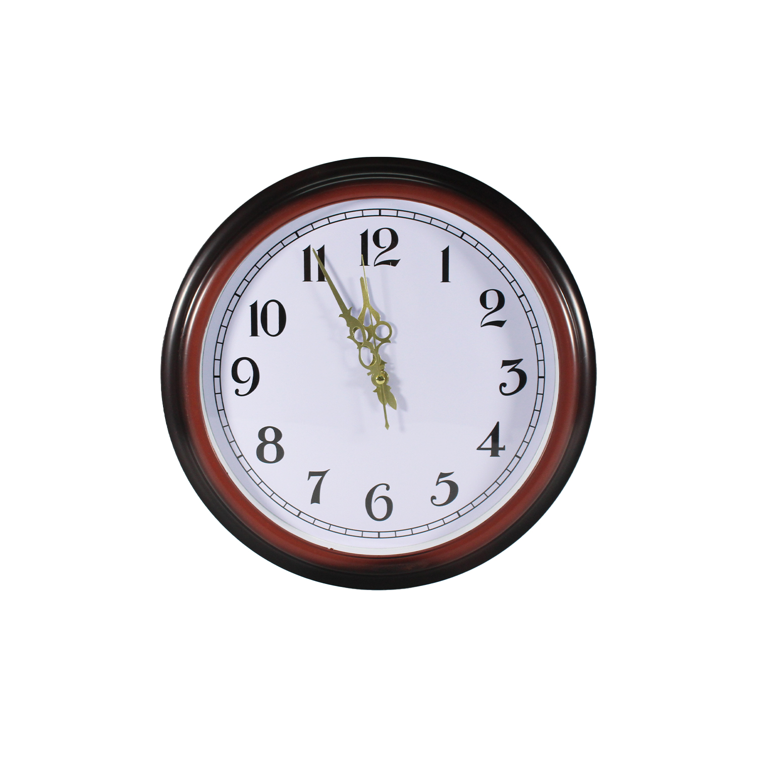 RELOJ DE PARED 40CM, BORDES CAFE MADERA, NUMEROS Y MANECILLAS NEGROS, PLASTICO, IDEAL PARA CUALQUIER ESPACIO, SIN PILAS (1XAA).