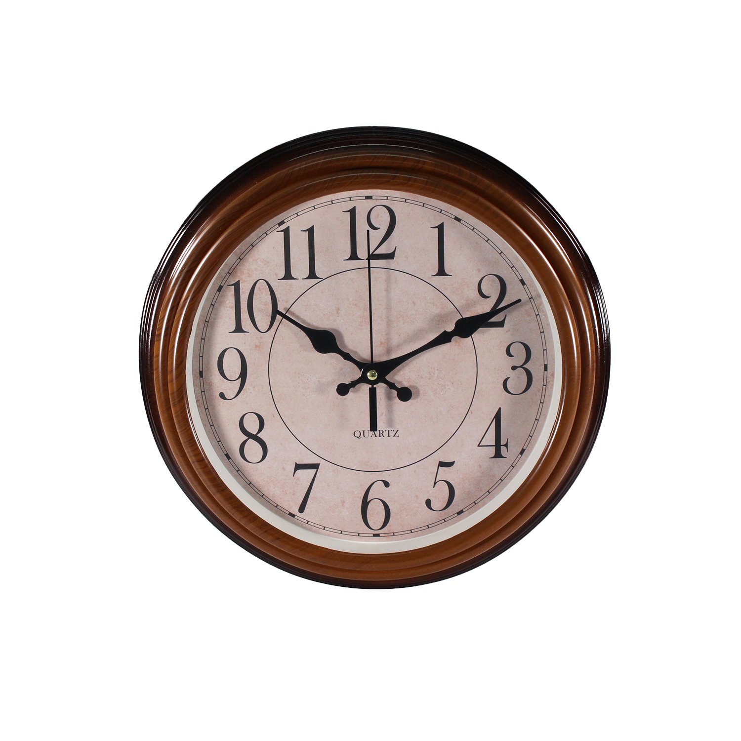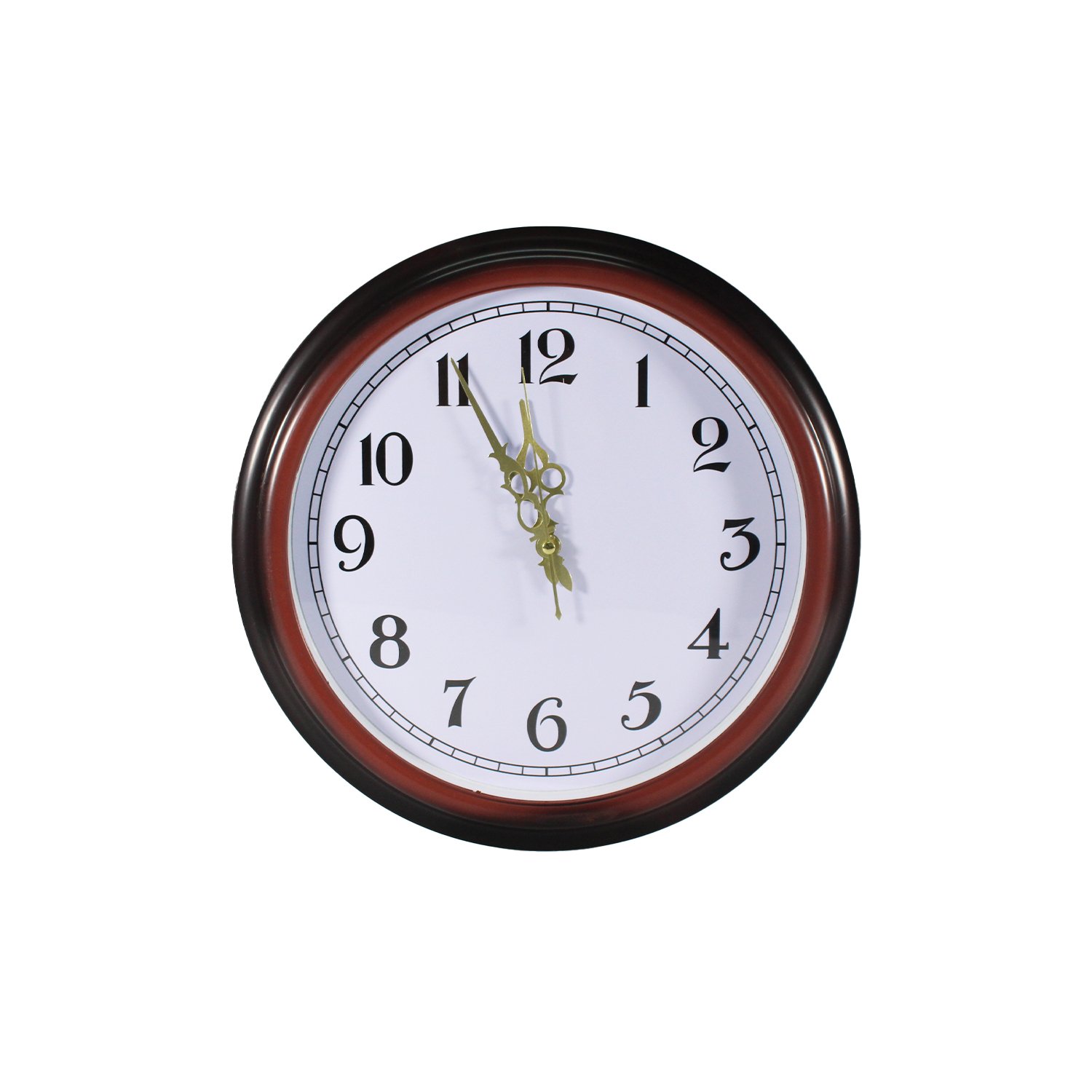 Reloj pared ~39 cm diámetro, Borde café madera, Manecillas/números negros, Plástico, Ideal sala/comedor, No incluye pila (1×AA)