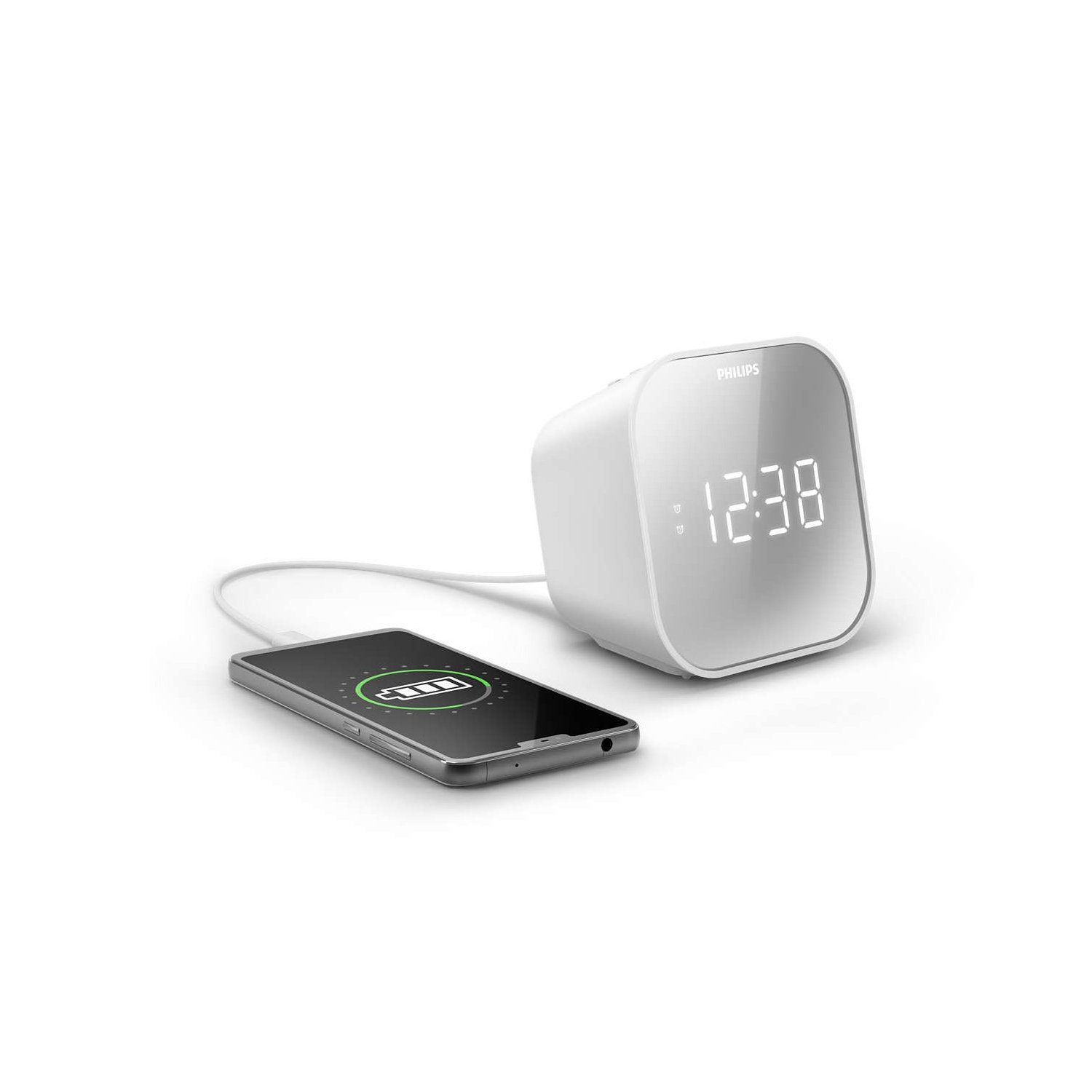 Radio reloj despertador Philips, Permite cargar dispositivo móvil, Despertar con alarma o radio, Volumen que sube gradualmente, Temporizador, Radio FM, Dígitos grandes, Puerto USB para carga, Batería de reserva, Alarma dual (tono o radio), 20 presintonías, RMS 700 mW, Mono