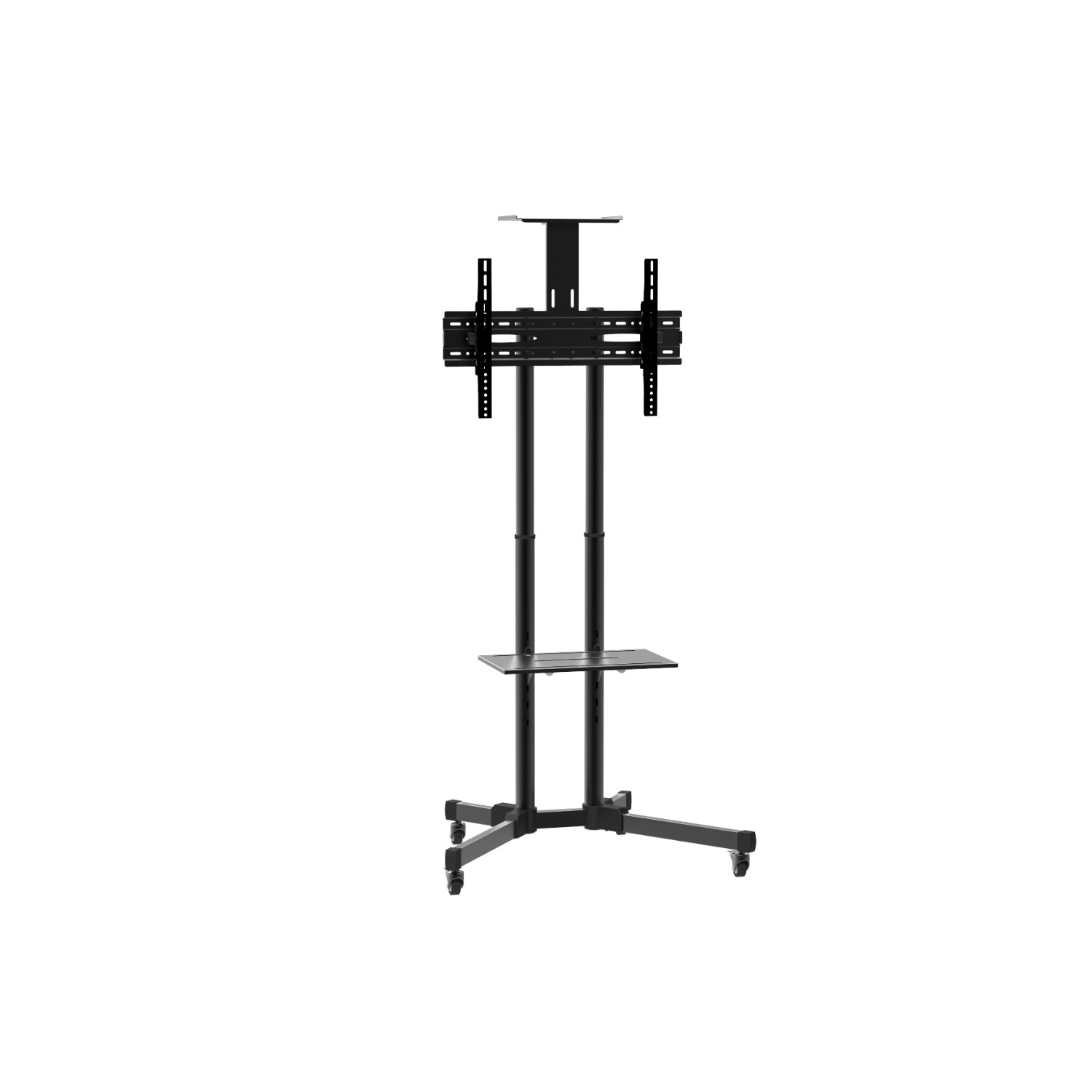 Soporte rack pedestal para tvs de 37 a 70 pulgadas. es muy firme y sólido, armable e ideal para transportar. tiene 2 estantes con altura ajustable, permite el ajuste de altura y la inclinación de 15° y la organización de los cables por tubos.