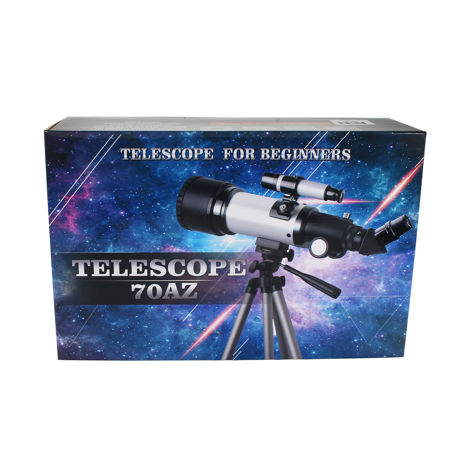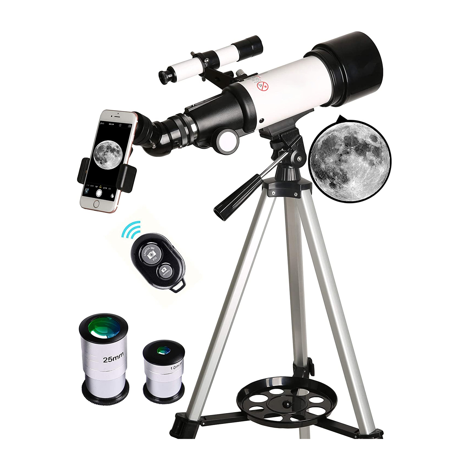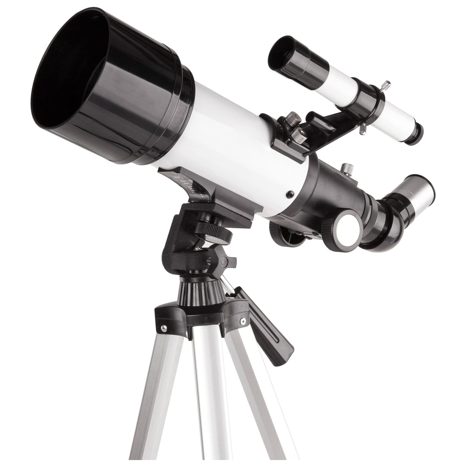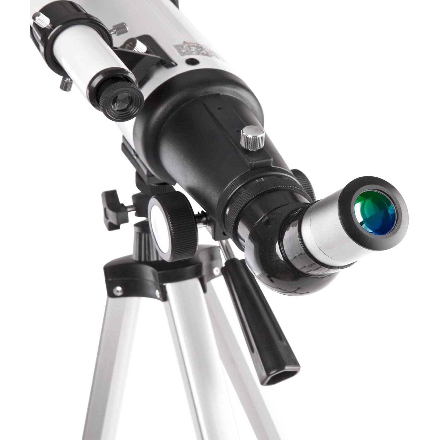 Diámetro lente 70 mm, focal 400 mm, oculares K9mm (44.5X) y K20mm (20X), incluye trípode de aluminio y espejo lunar, montaje rápido sin herramientas.