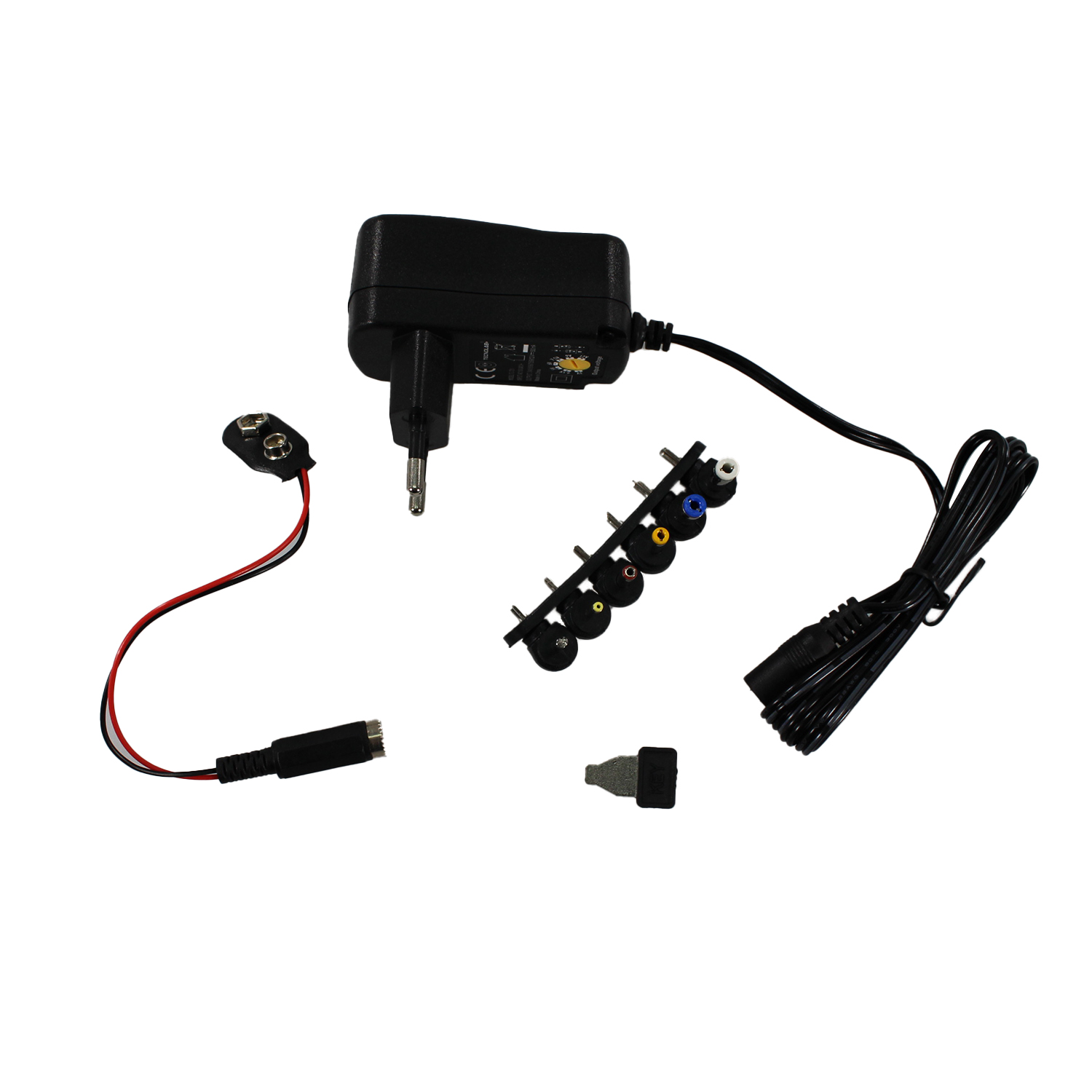 Incluye 6 puntas intercambiables que lo hacen compatible con diferentes entradas, además de un cable conector de 9V de 15 cm para baterías tipo clip. Su diseño compacto lo convierte en un accesorio ideal para el hogar, oficina o uso técnico.