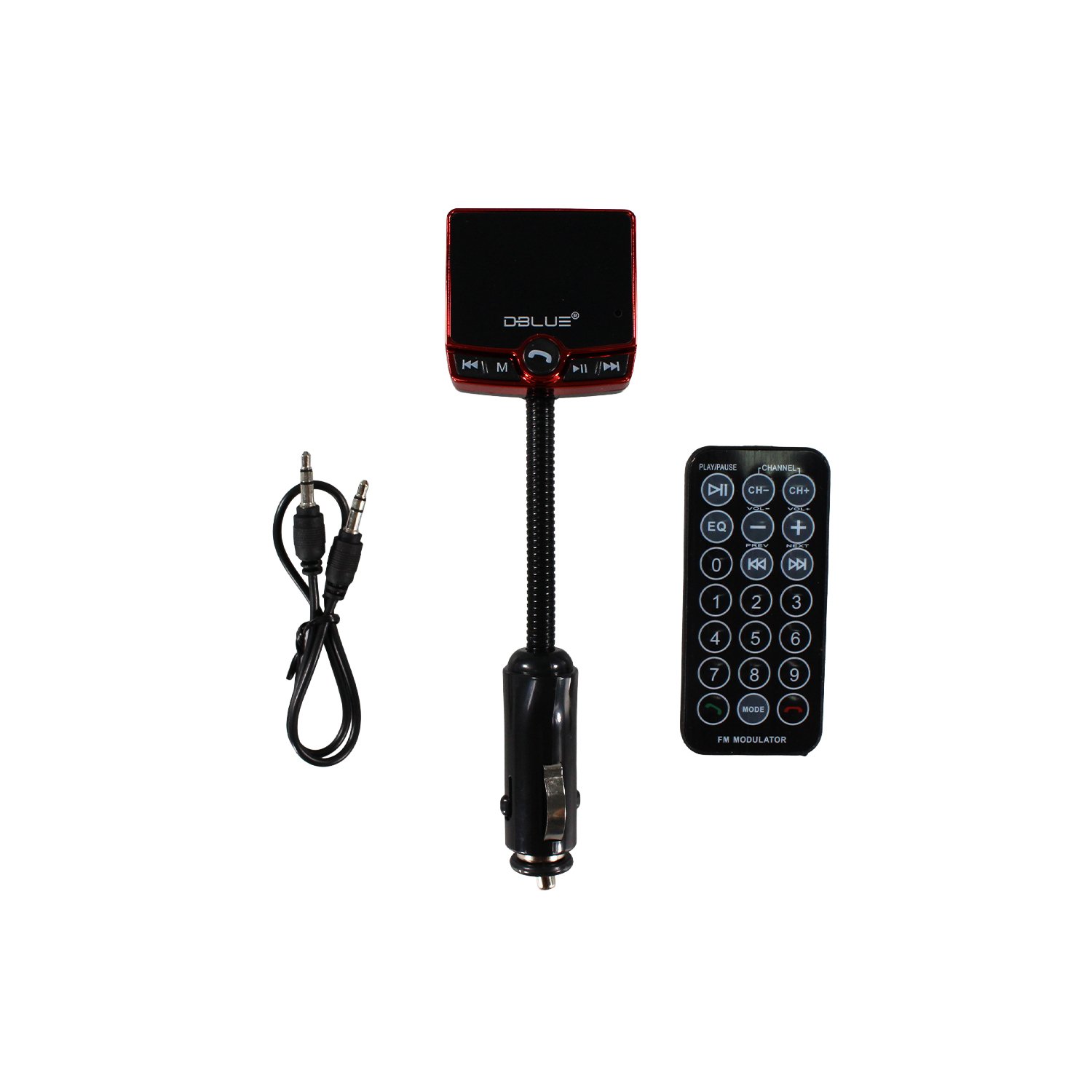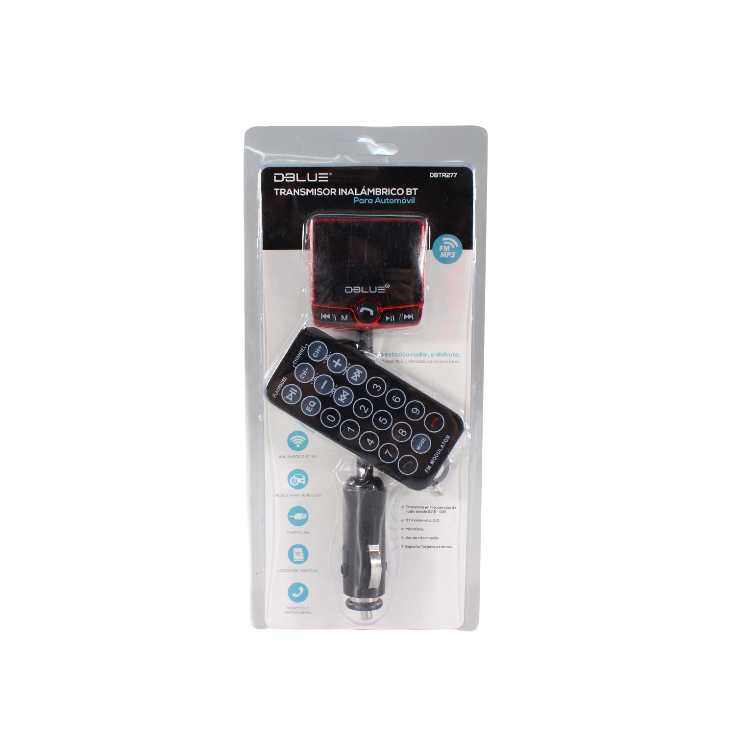 Transmisor FM, bluetooth 3.0, USB doble y tarjeta TF, microfono manos libres, pantalla LED y control remoto.