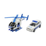 Descubre la aventura policial en miniatura con este camión remolque y su vehículo policía de helicóptero a escala 1:18.