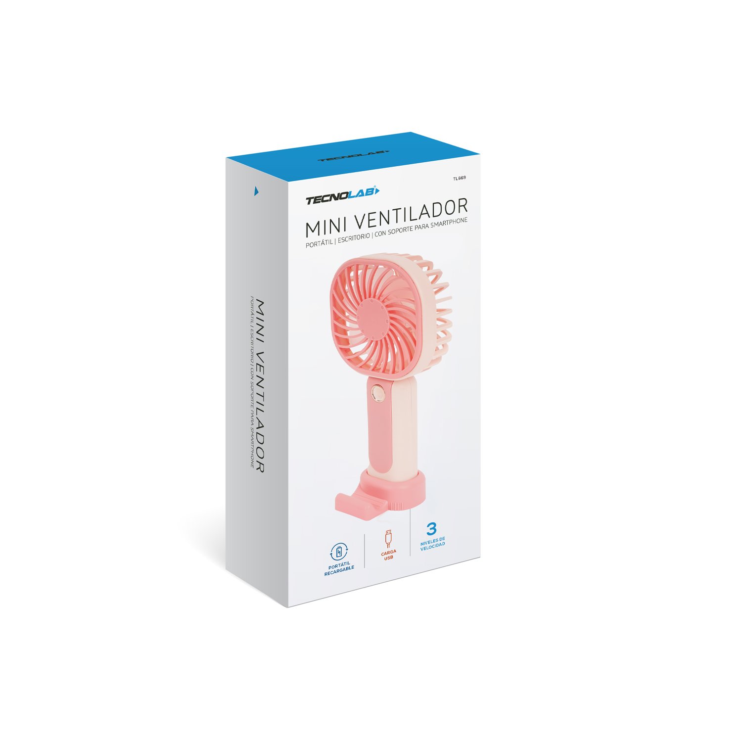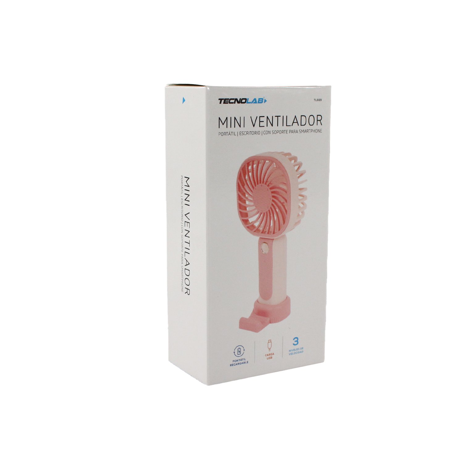 VENTILADOR TECNOLAB PORTATIL RECARGABLE, FLUJO AJUSTABLE, CARGA USB, BATERIA RECARGABLE DE 400MAH – PINK